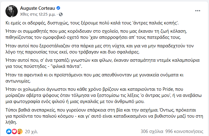 Τέλος πάντων, προχωράμε, ο κύριος Κορτώ δεν κατανοεί καθόλου τη σήμαινε και τι σημαίνει άντρας και απλά μας προβάλει την εικόνα που η νοοτροπία του(της εκφυλίας) έχει πλάσει από τα παιδικά του χρόνια: το πρότυπο του ανασφαλούς ψευτομάτσο άντρα του πολλά βαρύ... με άλλα λόγια του Περιάνδρου Πόποτα, μιας παιδικής επίσης προβολής από επίσης τον επίσης γκέι και εφταμηνίτικο Χάρη Ρώμα. Φανταστείτε πως θα ένιωθε ο Κορτώ απέναντι σε έναν άντρα που του ζήταγε να δικαιολογήσει τις μπούρδες που γράφει στο facebook, πως τα πλαδαρά πόδια του θα έτρεμαν κοκ.