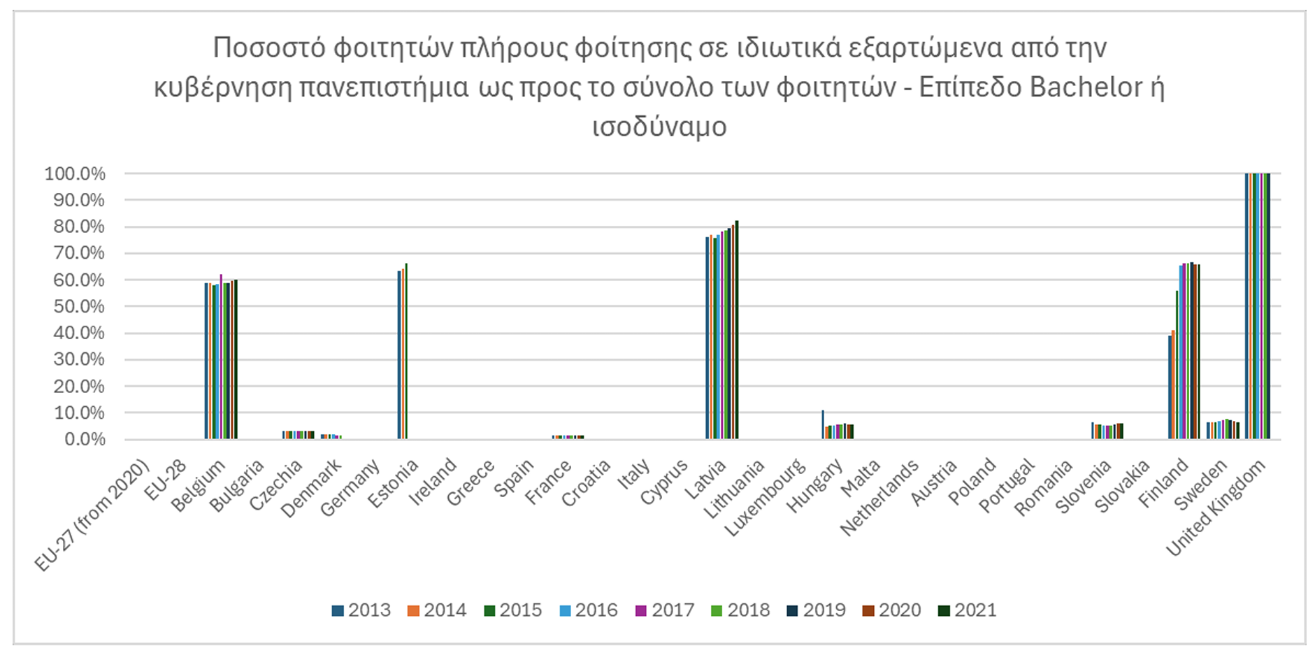 Με βάση τα στοιχεία της Eurostat η συντριπτική πλειονότητα (άνω του 83%) των εγγεγραμμένων φοιτητών (πλήρους φοίτησης) σε προγράμματα σπουδών επιπέδου Bachelor ή ισοδύναμου, φοιτούν σε δημόσια πανεπιστήμια. Στην Ελλάδα, το Λουξεμβούργο, τη Δανία, την Ιρλανδία και την Ολλανδία, το ποσοστό αυτό ανέρχεται ή αγγίζει το 100%. Επίσης, σε χώρες όπως η Μάλτα, η Βουλγαρία, η Εσθονία (την τελευταία 5ετία), η Γαλλία, η Κροατία, η Λιθουανία, η Ρουμανία, η Σλοβακία και η Σουηδία, τα ποσοστά κυμαίνονται μεταξύ 85-93%. Στον αντίποδα βρίσκονται η Λετονία και το Ηνωμένο Βασίλειο, όπου το 100% φοιτούν, σύμφωνα με τη Eurostat, σε ιδιωτικά πανεπιστήμια. Πρέπει ωστόσο να τονιστεί πως τα πανεπιστήμια στο Ηνωμένο Βασίλειο είναι κατά βάση δημόσια (μόλις 10 ή λιγότερα ιδιωτικά δίνουν πανεπιστημιακά πτυχία) αλλά είναι ανεξάρτητοι οργανισμοί και για το λόγο αυτό η Eurostat τα κατατάσσει στην κατηγορία των ιδιωτικών αλλά, με ελάχιστες εξαιρέσεις, χρηματοδοτούνται από δημόσιους πόρους μέσω της επιδότησης των διδάκτρων και όχι μόνο. Το ίδιο ισχύει και για τη Λετονία, στην οποία λειτουργούν δημόσια και ιδιωτικά πανεπιστήμια. Επίσης, σε ιδιωτικά πανεπιστήμια φοιτούν περίπου το 60-65% των φοιτητών σε Βέλγιο, Κύπρο και Φινλανδία.