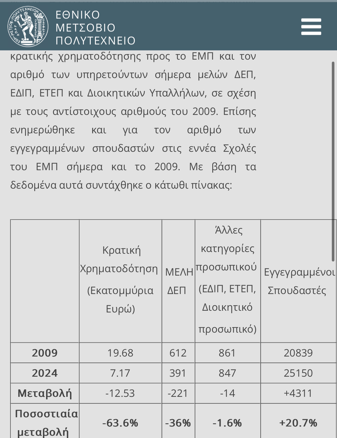 Επίσης, ο πίνακας που έβαλες συγκρίνει τα ετη 2009-2024 όπου προφανώς η χρηματοδότη είναι πιο κάτω σε σχέση με τότε καθώς το συνολικό ΑΕΠ της χώρας είναι πιο κάτω σε σχέση με τότε. Εσυ όμως μίλησες καθαρά για τα τελευταία 5 χρόνια (όχι 15 χρόνια που έβαλες τώρα ώστε να γυρίσεις τα στατιστικά υπέρ σου). Βάλε μας τον πίνακα του ΕΜΠ για την περίοδο 2019-2024 ώστε να δούμε αν η τωρινή κυβέρνηση μειώνει συνεχώς την χρηματοδότηση των ΑΕΙ όπως έγραψες στο προηγούμενο post.