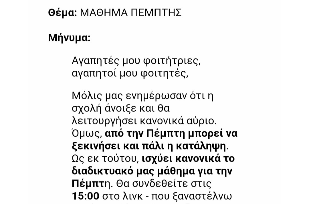 ?????????Κι εμάς άνοιξε η φιλοσοφική, αλλά όλοι οι καθηγητές συνεχίζουν τα διαδικτυακά, τουλάχιστον μέχρι την Παρασκευή, γιατί λένε ότι θα ξανά κλείσει..