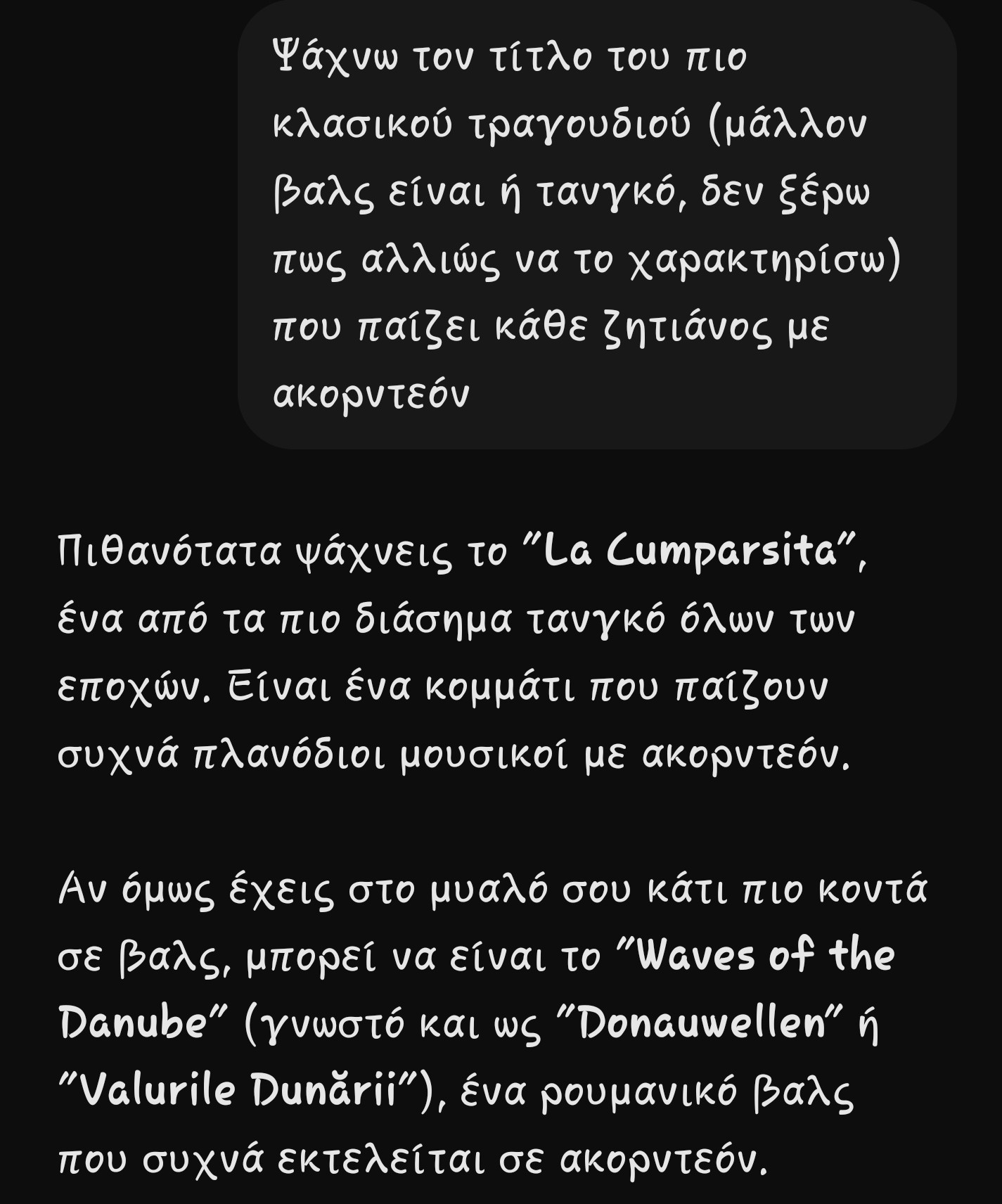 Αυτό θα ισχυε αν το ήξερα ήδη το κομμάτι και προσπαθούσα να σκεφτώ ποιο μπορεί να είναι. Από βαλς ξέρω μόνο της αμελι, απολύτως κανένα άλλο. Το shazam τότε δεν έχει λόγο ύπαρξηςHerbert Von Karajan - Wiener Philharmoniker - An Der Schoenen Blauen Donau, op. 314