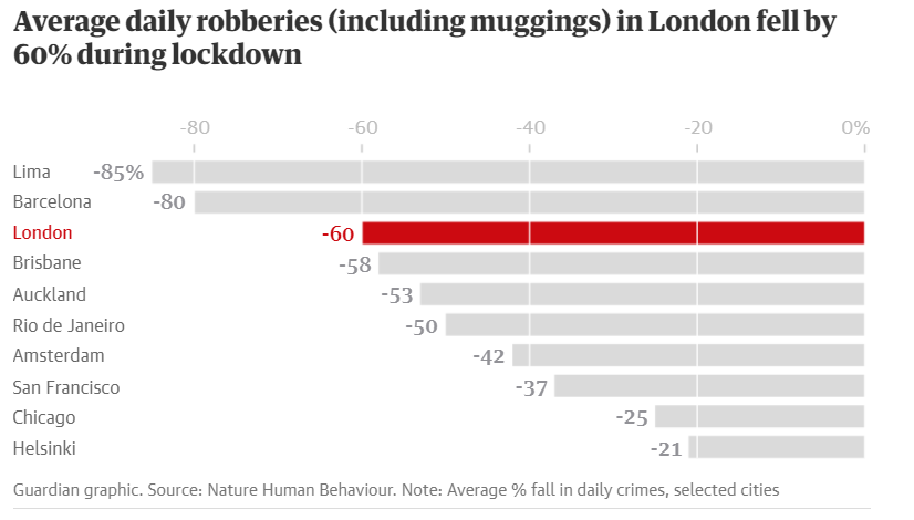 COVID-19 caused a reduction in many types of crime around the world.[3] A report by USA Today on 4 April 2020 showed a decrease in criminal incidents (in America) since 15 March in nineteen out of twenty police agencies examined.[4] However, the report also noted an increase in domestic violence.[4]