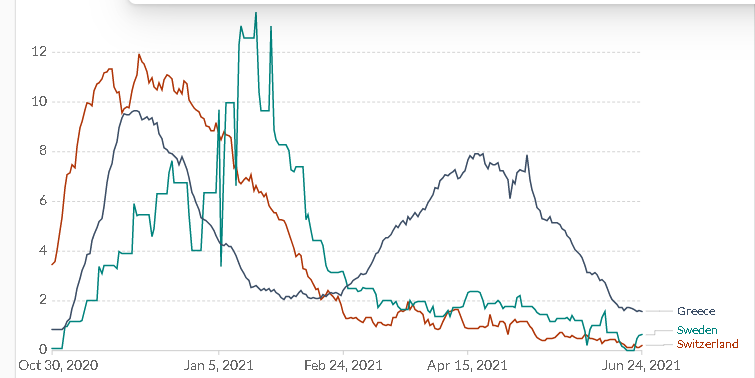 Μου δείχνεις μόνο τους τελευταίους μήνες ενώ δεν καταλαβαίνεις πως λειτουργεί ο ιός. Το πιο δίκαιο είναι να κοιτάμε συνολικά την πανδημία και όχι να λέμε "το πρώτο κύμα δεν μετράει". Αντίθετα το ότι δεν υπήρχε πληθυσμός με ανοσία στο δεύτερο και το τρίτο κύμα σε σχέση με τις άλλες χώρες (όπως την Ελβετία) μας έφερε σε χειρότερη θέση για το τρίτο κύμα.