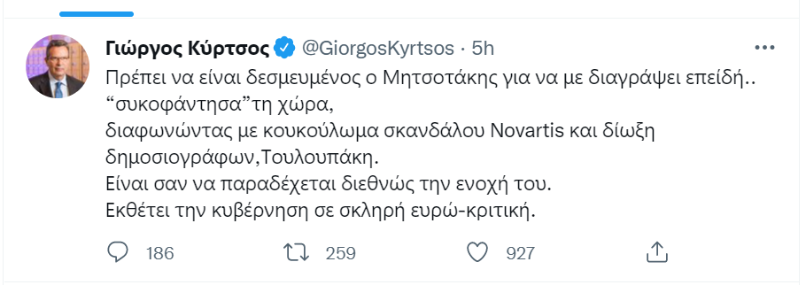 Απρίλιος 2021, ο Μητσοτάκης παίρνει τηλέφωνο τον Κύρτσο και του λέει σταμάτα ένα tweet να κάνεις ακόμα για την κακή διαχείριση της πανδημίας σε διέγραψα.