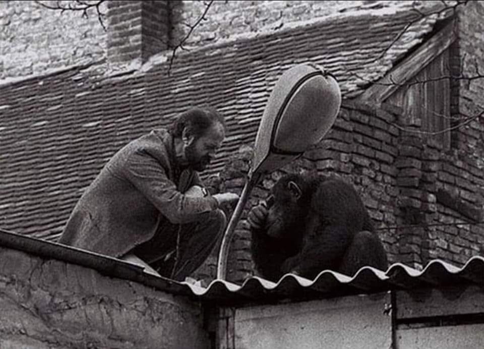Αρχική Δημοσίευση από facebook.com:Για το χιμπατζή δεν θα σχολιάσω κάτι παρά θα ποστάρω ξανά τη φωτογραφία από τις διαπραγματεύσεις του διευθυντή του ζωολογικού κήπου του Βελιγραδίου με τον Σάμι, το χιμπατζή που το σκασε(1988). Τον επισκέφτηκε στην οροφή του κτιρίου -οπου είχε ανέβει για ν αποφύγει τους υπαλλήλους του ζωολογικού που τον κυνηγουσαν με αναισθητικα οπλα- και τον έπεισε να γυρίσει! Υπάρχει άγαλμα του Σάμι στο ζωολογικό κήπο Βελιγραδίου.