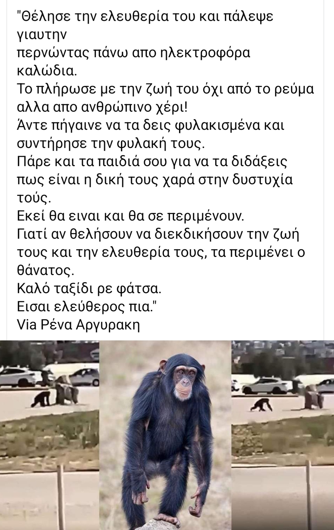 Και συνεχιζω να αναρωτιέμαι με αυτά που διαβάζω αν απέδρασε ο Γκοτζιλα τελικά ή ένας απλός χιμπατζής σε ενα μερος που τους εδινε το περιθωριο του χρονου για μια 10λεπτη τελικα ενέργεια