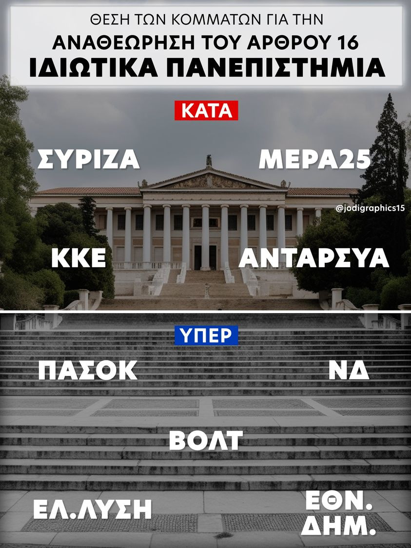 Ο Μητσοτακης, η Κεραμεως και η ΝΔ ειναι υπερ της αναθεωρησης του αρθρου 16, το οποιο αρθρο απαγορευει την ιδρυση, λειτουργια και αναγνωριση ιδιωτικων πανεπιστημιων.