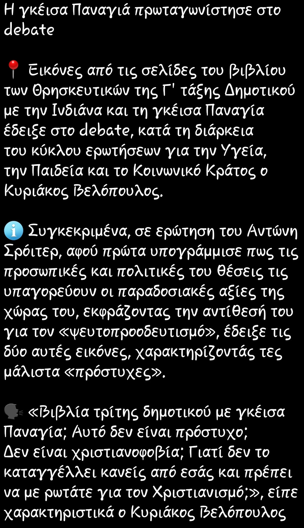 Καλά εκεί για την παιδεία ήταν ψιλό άσχετα αυτά που έλεγε..αλλα γενικά είχε μια τίμια προσέγγιση...ειδικά στα θέματα εθνικής άμυνας ήταν κατατοπιστικός και σωστός...MVP: Βελόπουλος,