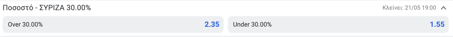 Δεν τον έχει κατω από 30. Τον έχει ακριβώς 30... Το είδα μόλις τώρα.Δεν ξέρω, αλλά από χθες που τα κοίταξα έχει διαφορές. Δεν ξέρω αν γνωρίζουν κάτι για τα exit polls, αλλά τώρα το under 30% για τον ΣΥΡΙΖΑ φαντάζει επικρατέστερο ενώ μέχρι χθες ήταν πιθανότερο να το ξεπεράσει.