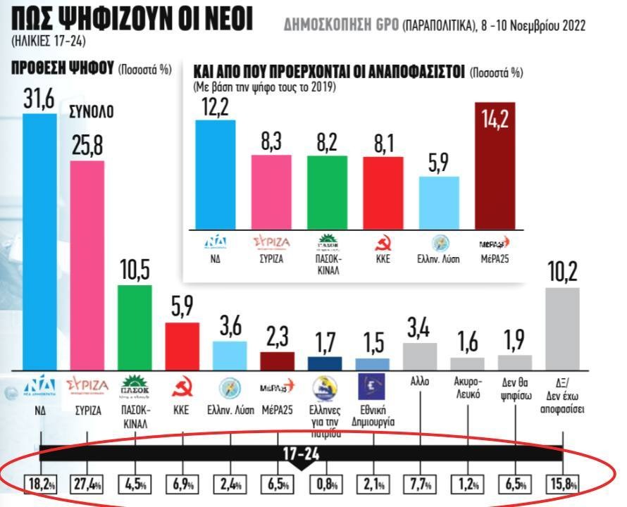 Καλά το ότι η πλειοψηφία της νεολαίας ψηφίζει ΣΥΡΙΖΑ, ΝΔ, ΠΑΣΟΚ είναι από μόνο του αρκετό για να πεις ότι το επιχείρημα " οι παλιοί μας κατέστρεψαν " δεν στέκει. Οι παλιοί πράγματι ρήμαξαν τη χώρα αλλά και εμείς έχουμε πάρει την σκυτάλη για να την αποτελειώσουμε. Επάξια συνεχίζουμε την καταστροφή.