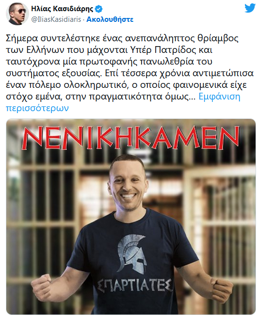 Πάντως δεδομένης της εισόδου Σπαρτιατών και του ότι όλοι οι υπόλοιποι εντός βουλής θα την εξισώνουν με τη ΧΑ, έχουμε ξεκάθαρα 4 χρόνια ακόμα που η νδ θα αραδιάζει "ο σύριζα που πλευρίζει τη ΧΑ", επειδή και οι δύο ως αντιπολίτευση θα ταυτίζονται στην καταψήφιση νομοσχεδίων.