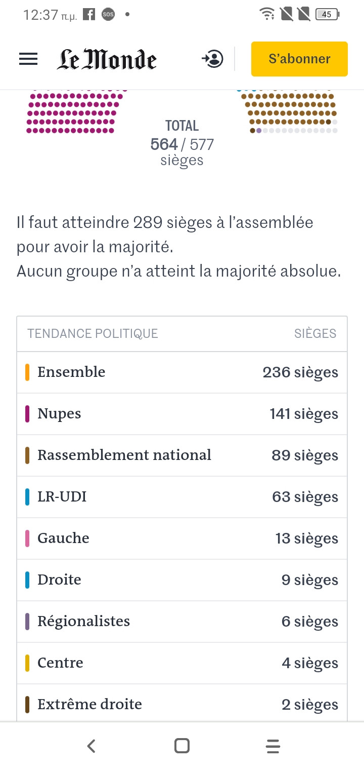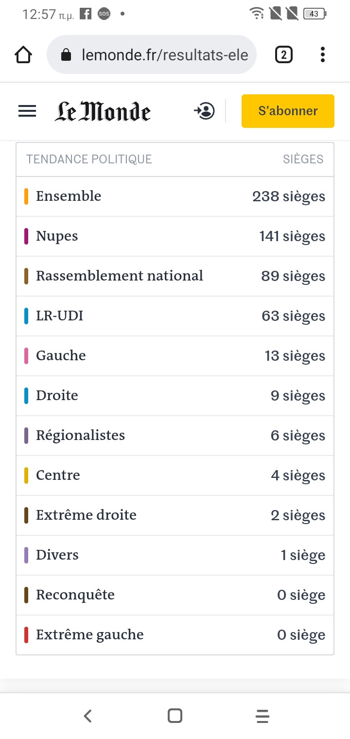 Όπως είπα , οι τελευταίες έδρες πάνε στο Μακρον που λογικά θα φτάσει περίπου τις 247 έδρες.