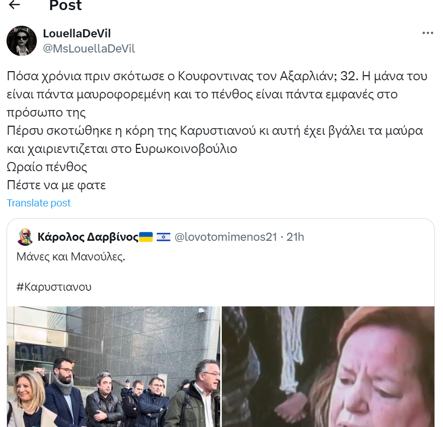 Όταν πραγματικά με νύχια και με δόντια προσπαθείς να βγάλεις απο τη μύγα ξίγκι ώστε να στριμώξεις μια στάλα αηδίας που στα μάτια σου μοιάζει επιχείρημα.Προσπαθεί ο προπαγανδιστικός μηχανισμός της νδ να μειώσει την Καρυστιανού. Μπράβο πάντως στην νδ, δείχνουν πόσο αξία δίνουν στις γυναίκες, έχουμε μια συγκροτημένη γυναίκα η οποία μάχεται και κάνουν ό,τι μπορούν για να τη μειώσουν.