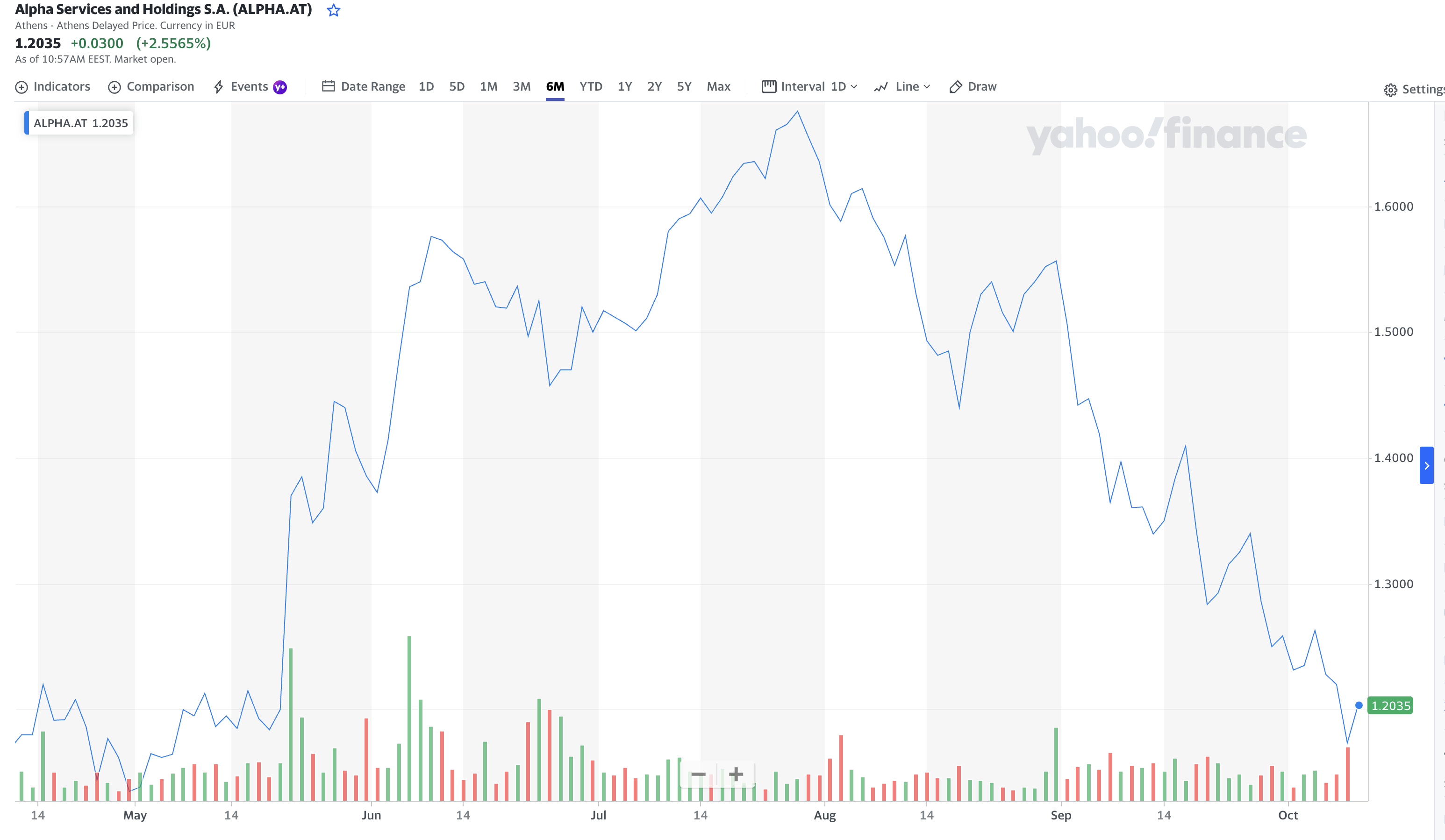 Μην πιάσω το χρηματιστήριο.Μετά τις εκλογές και μέχρι το καλοκαίρι έλεγαν για το success story του ελληνικού χρηματιστηρίου, την άνοδο, ότι θα απογειωθεί από φθινόπωρο με την επενδυτική βαθμίδα και τέτοια. Τώρα ξέρεις τι γίνεται; Μάλλον όχι γιατί δεν προβάλλεται πουθενά.Όσοι τους άκουσαν(λίγοι ελπίζω) και επένδυσαν το καλοκαίρι, ορίστε τι έπαθαν:
