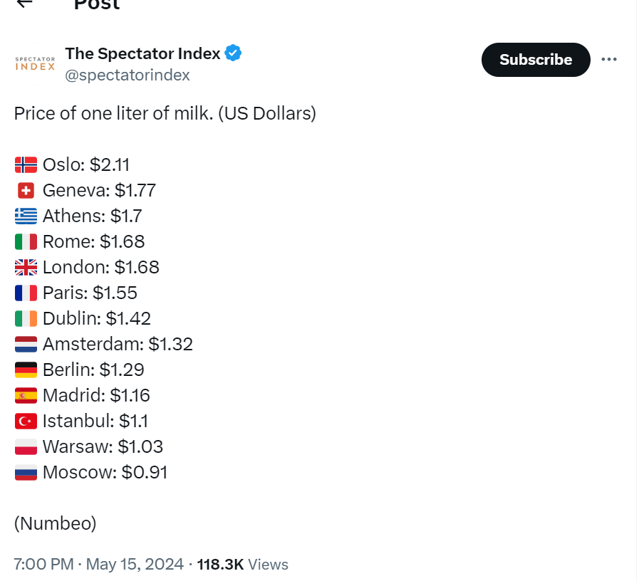 Στη Γερμανία το γάλα (1 λίτρο) κοστίζει γενικά από 1.50 ευρώ και άνω, αλλά στα Lidl μπορείς να βγεις γάλα και με 70 λεπτά. Ανάλογα το μάρκετ τα 750 ml (δεν είδα ποτέ 500 ml) γάλα κοστίζουν σχεδόν 1 ευρώ ώστε το ένα λίτρο να έχει και 1.75-1.89 ευρώ. Βέβαια, η τιμή έχει και τις συνέπειές της στην υγεία του καταναλωτή ή στην ποιότητα αλλά και ασφάλεια του τροφίμου. Η λίστα δεν λέει ακριβώς την αλήθεια. Τέτοιες λίστες γενικά λένε το ψεματάκι τους για να δημιουργούν σκοπιμότητες μεταξύ χωρών και οικονομιών. Καμία χώρα δεν "μαθαίνεται" από την στατιστική. Πρέπει να φας στη μάπα το βαθύ κράτος και την καθημερινή ζωή για να δείτε ότι τα περισσότερα είναι ένα παραμύθι που δεν τα ξέρεις και δεν τα βλέπεις ως τουρίστας ή αναγνώστης απλά.