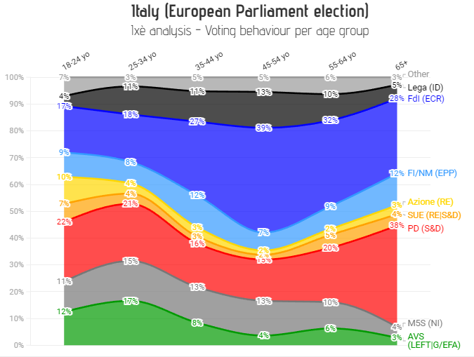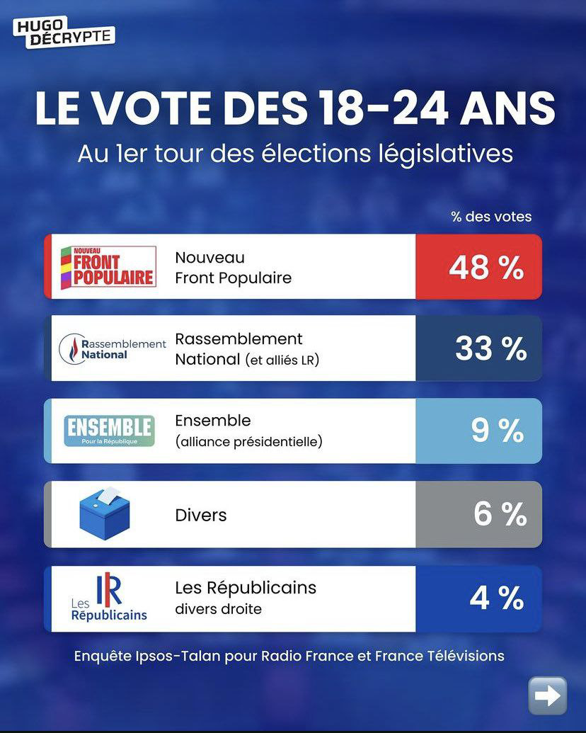 Στη Γαλλία το αριστερό Λαϊκό μέτωπο πήρε με διάφορα τα υψηλότερα ποσοστά του στους νέους και τα χαμηλότερα στους ηλικιωμένους. (Τα υψηλότερα στους ηλικιωμένους τα πήραν οι liberals του μακρόν, ενώ η Λεπέν στους μεσήλικες).