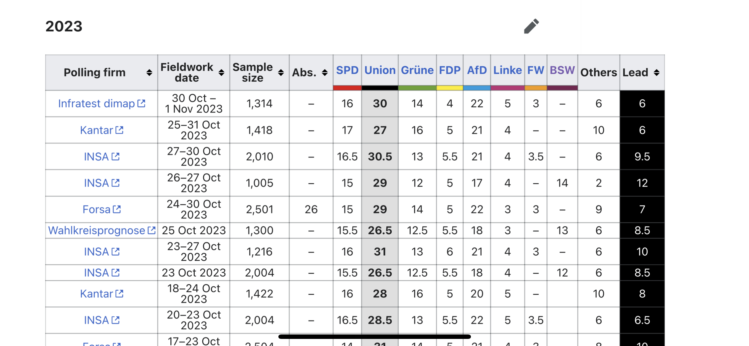 Δυο χρόνια μετά τις Γερμανικές εκλογές το κυβερνών SPD έχει χάσει 10 μονάδες και βρίσκεται μόλις στο 16%. Πρώτο κόμμα είναι το CDU με ποσοστά 30% ενώ δεύτερο έρχεται το AFD με 22%.