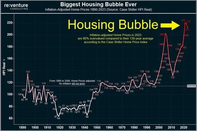 Όταν το βλέπεις αυτό η φούσκα ετοιμάζεται να κάνει μπαμ.Ένα ενδιαφέρον γράφημα που δείχνει τις τιμές των σπιτιών στην Αμερική, προσαρμοσμένες στον πληθωρισμό , βρίσκονται 80% πάνω από τον μέσο τους όρο και 20% ψηλότερα από τα υψηλά του 2008!