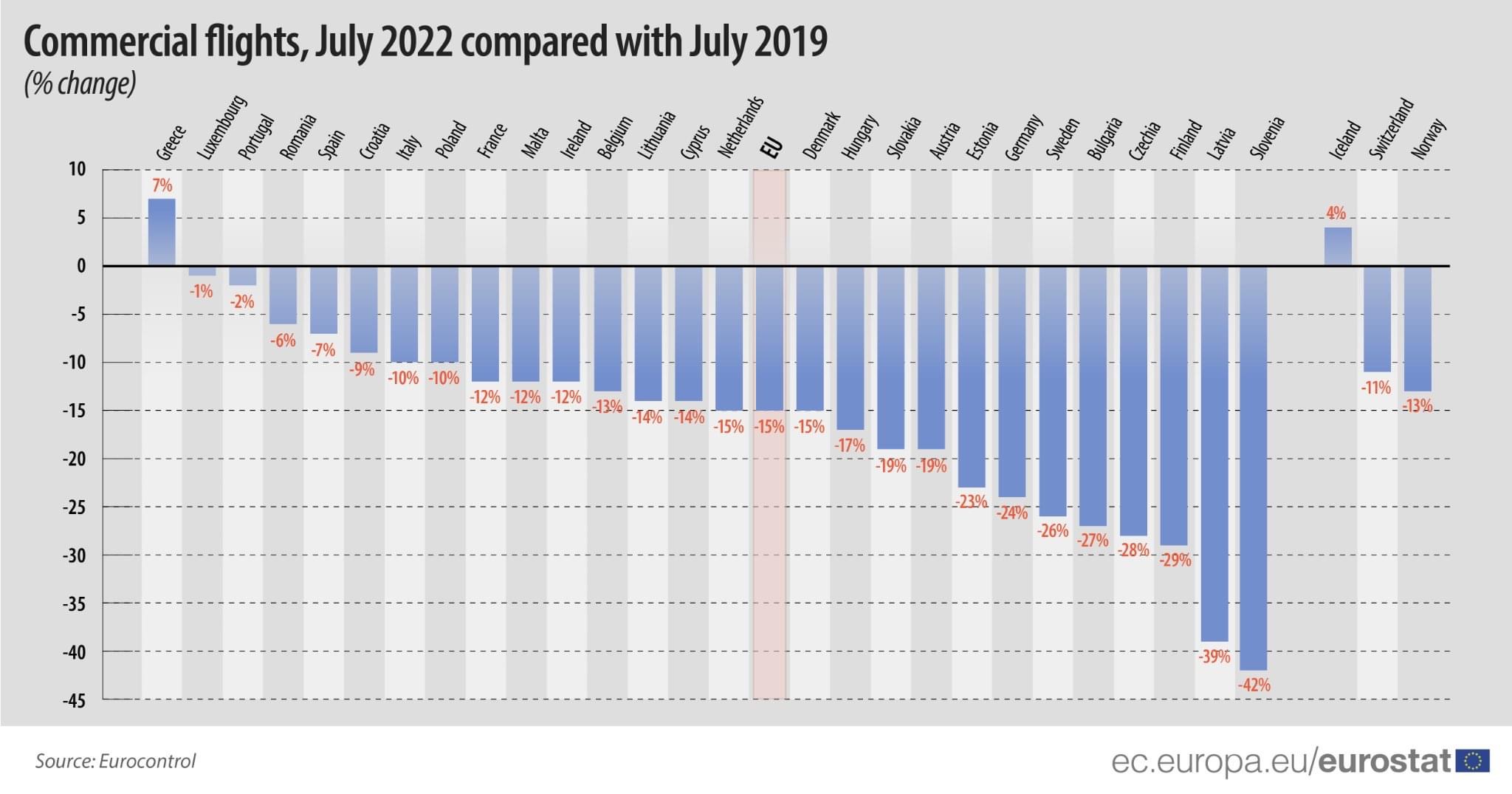 Σύμφωνα με τα τα επίσημα στοιχεία της Eurostat η Ελλάδα ήταν η μοναδική χώρα στην Ευρωπαϊκή ένωση όπου τον μήνα Ιούλιο είχε περισσότερες πτήσεις από και προς τα αεροδρόμια της σε σχέση με τον Ιούλιο του 2019 πρώτου αρχίσει η πανδημία. Η Ελλάδα κατέγραψε αύξηση 7% ενώ όλα τα αλλά κράτη σημαντική μείωση.