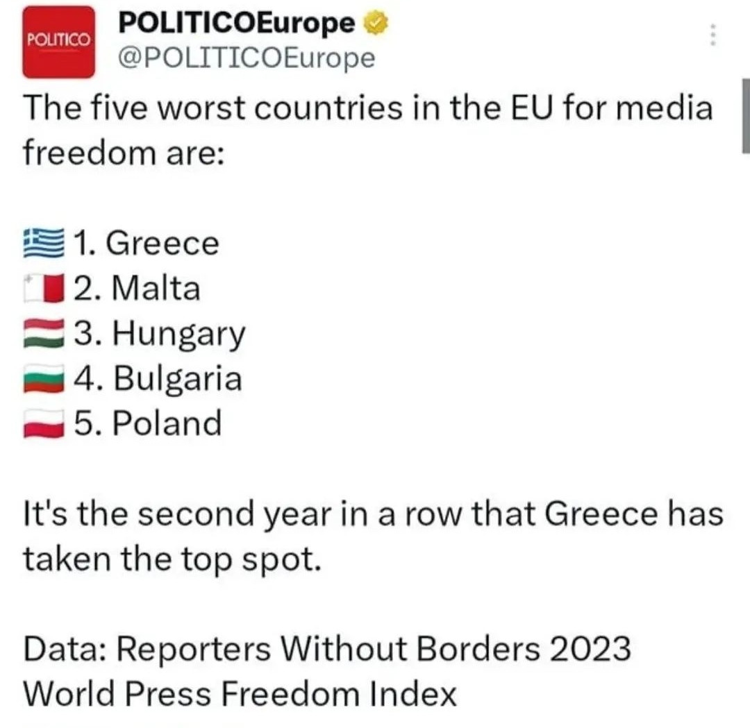 Επιτυχία Μητσοτάκη: Η Ελλάδα ξεπέρασε επιτέλους το Τσαντ σε ελευθερία του Τύπου σύμφωνα με τους RSF - Στην τελευταία θέση της ΕΕ και των Βαλκανίων η Ελλάδα
