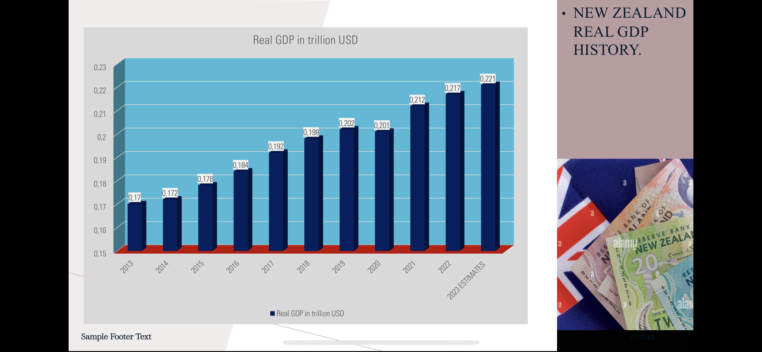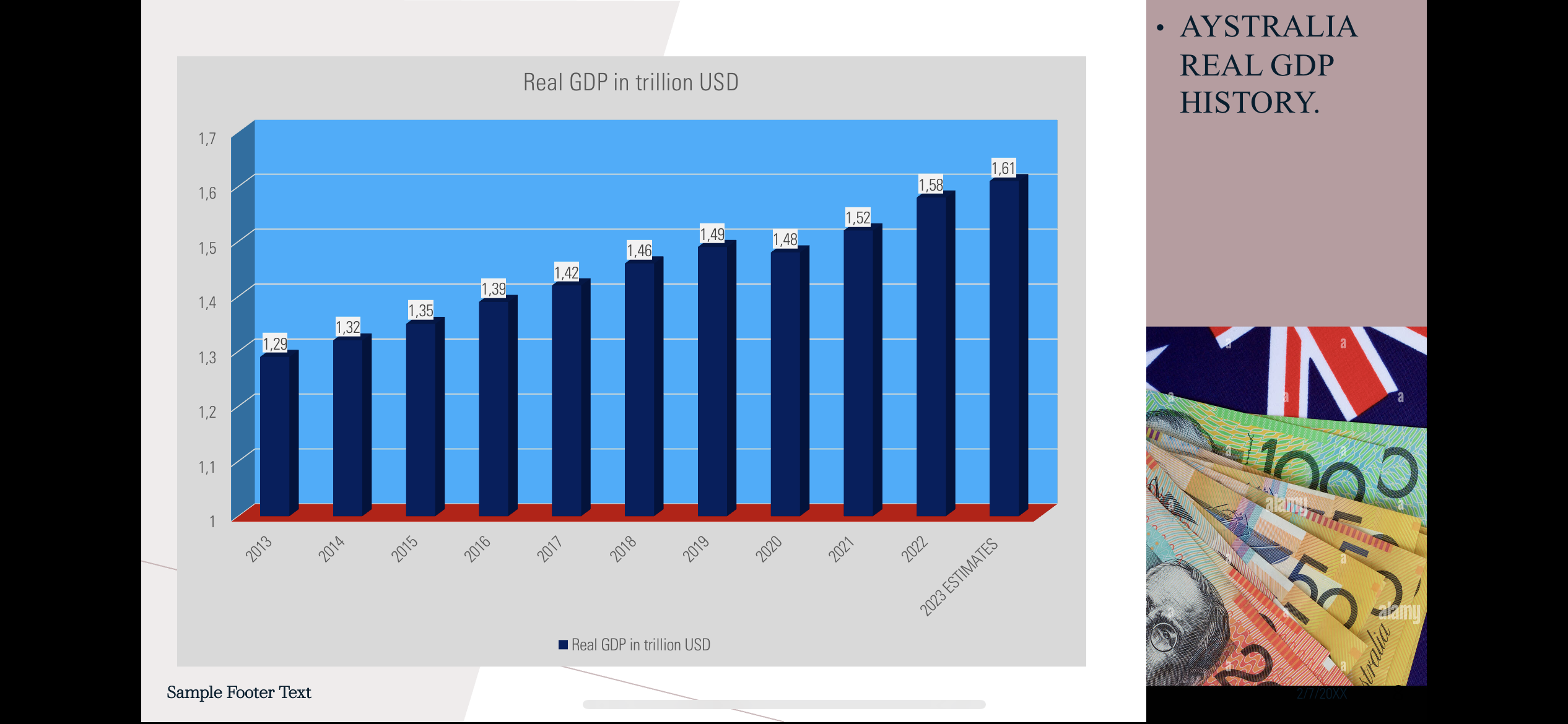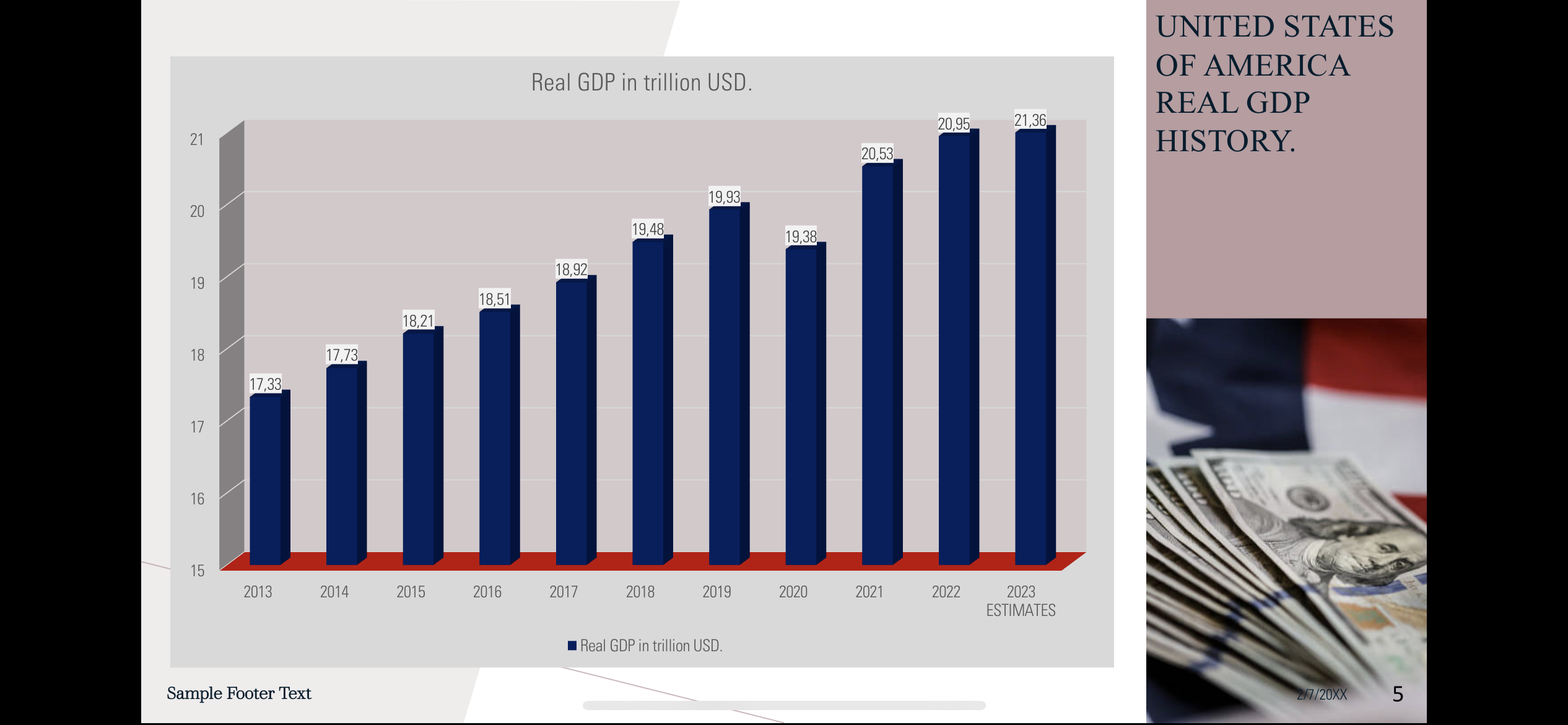 •Στη συνέχεια βλέπουμε την πορεία του ΑΕΠ τα τελευταία χρόνια. Τα στοιχεία αφορούν το πραγματικό ΑΕΠ σε τιμές 2015, δηλαδή έχουμε αφαιρέσει τον πληθωρισμό που μαστίζει όλες τις χώρες τα τελευταία δυο χρόνια.