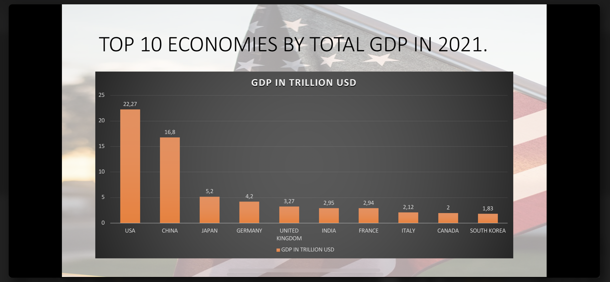 Τρομερή έκπληξη στη 1η θέσηΓια τα παιδιά που τους ενδιαφέρει!! Εδώ είναι ένα διάγραμμα με τις 10 μεγαλύτερες οικονομίες του πλανήτη για το 2021!! Τα στοιχεία για να φτιάξω το γράφημα τα πήρα από την παγκόσμια τράπεζα (world bank).