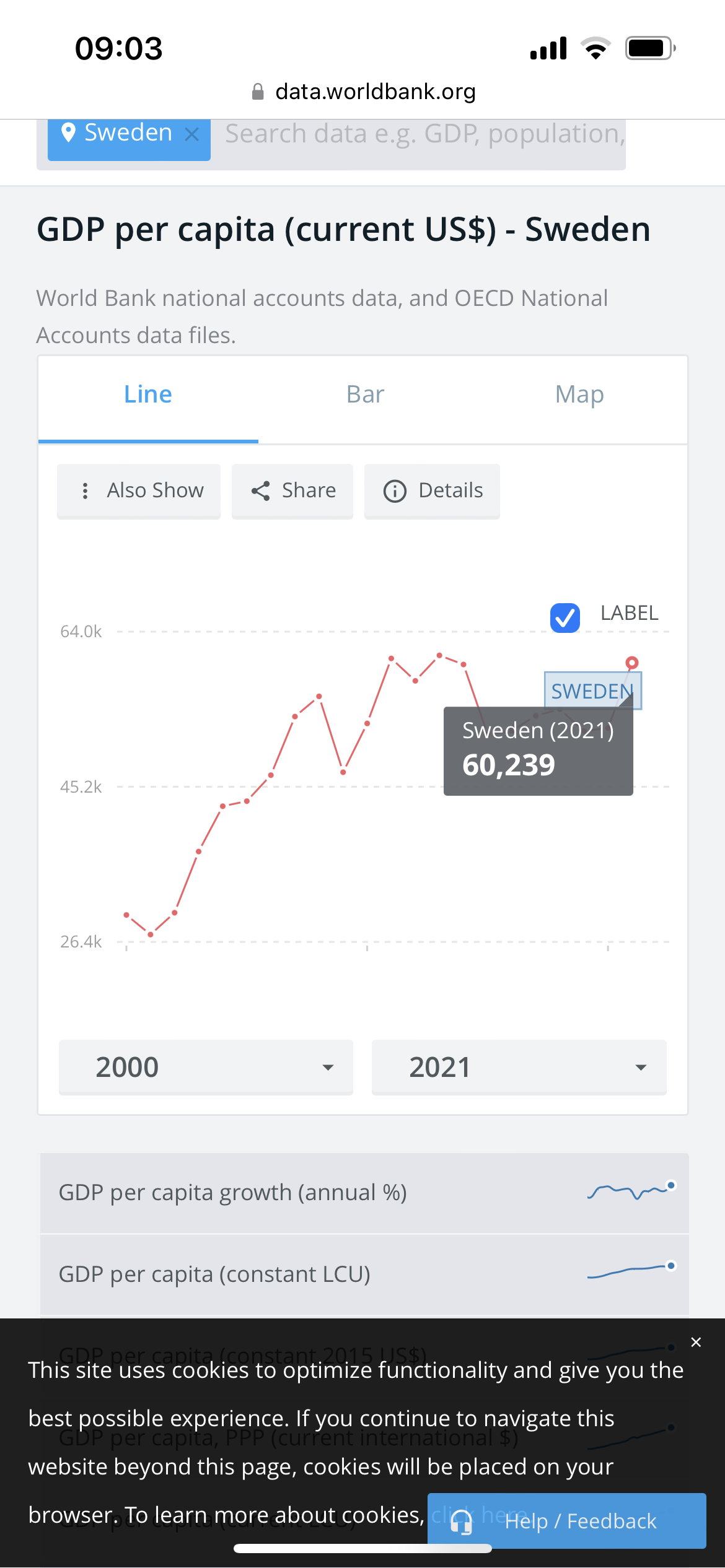 Η Σουηδία είχε μέσο κατά κεφαλην ΑΕΠ 60.000$ πέρσι , νούμερο που είναι μεγαλύτερο από αυτό του Καναδά (52.000$), της Γερμανίας (47.000$), της Βρετανίας (45.700$), της Γαλλίας (43.000$) και προφανώς αιώνες μπροστά από αυτό της Ελλάδας (20.700$). Επίσης ο μέσος ΚΑΘΑΡΟΣ μισθός στη Σουηδία είναι 3.000€ το μήνα , νούμερο που είναι μέσα στα 10 μεγαλύτερα παγκοσμίως. Δεν καταλαβαίνω λοιπόν για ποια εξαΰλωση μιλάς.