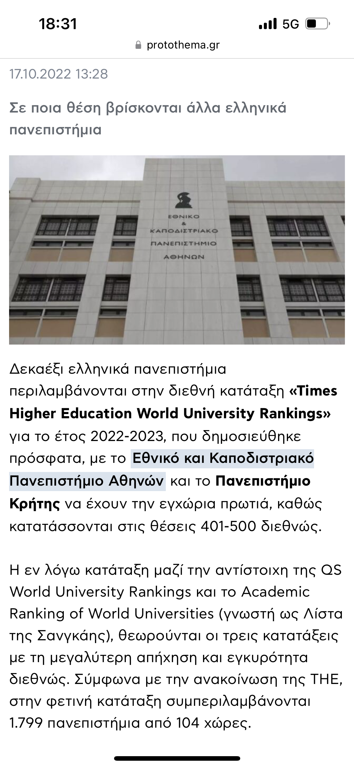 Ναι και εγώ μπορώ να γράψω ότι είμαι ο πιο πλούσιος άνθρωπος στον πλανήτη δεν σημαίνει ότι ισχύει. Σε καμία περίπτωση το Εκπα δεν ειναι στα 200 καλύτερα πανεπιστήμια διεθνώς , στην καλύτερη θέση που το βρήκα ήταν θέση 264 ενώ στις υπόλοιπες λίστες ήταν 400-Τώρα αν θεωρούμε επιτυχία για την Ελλάδα να έχουμε 1 πανεπιστήμιο που μπαίνει στο top 500 και αυτό με το ζόρι όταν όλες οι άλλες χώρες έχουν τουλάχιστον 1 πανεπιστήμιο τους στο top 150 τότε τι να πω , μάλλον δεν υπάρχει σωτηρία.Λες 450η θέση το ΕΚΠΑ, εγώ στη σελίδα του ΕΚΠΑ βρίσκω αυτό: