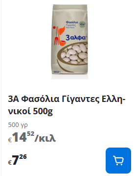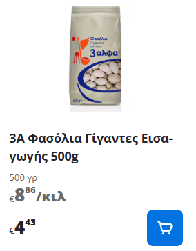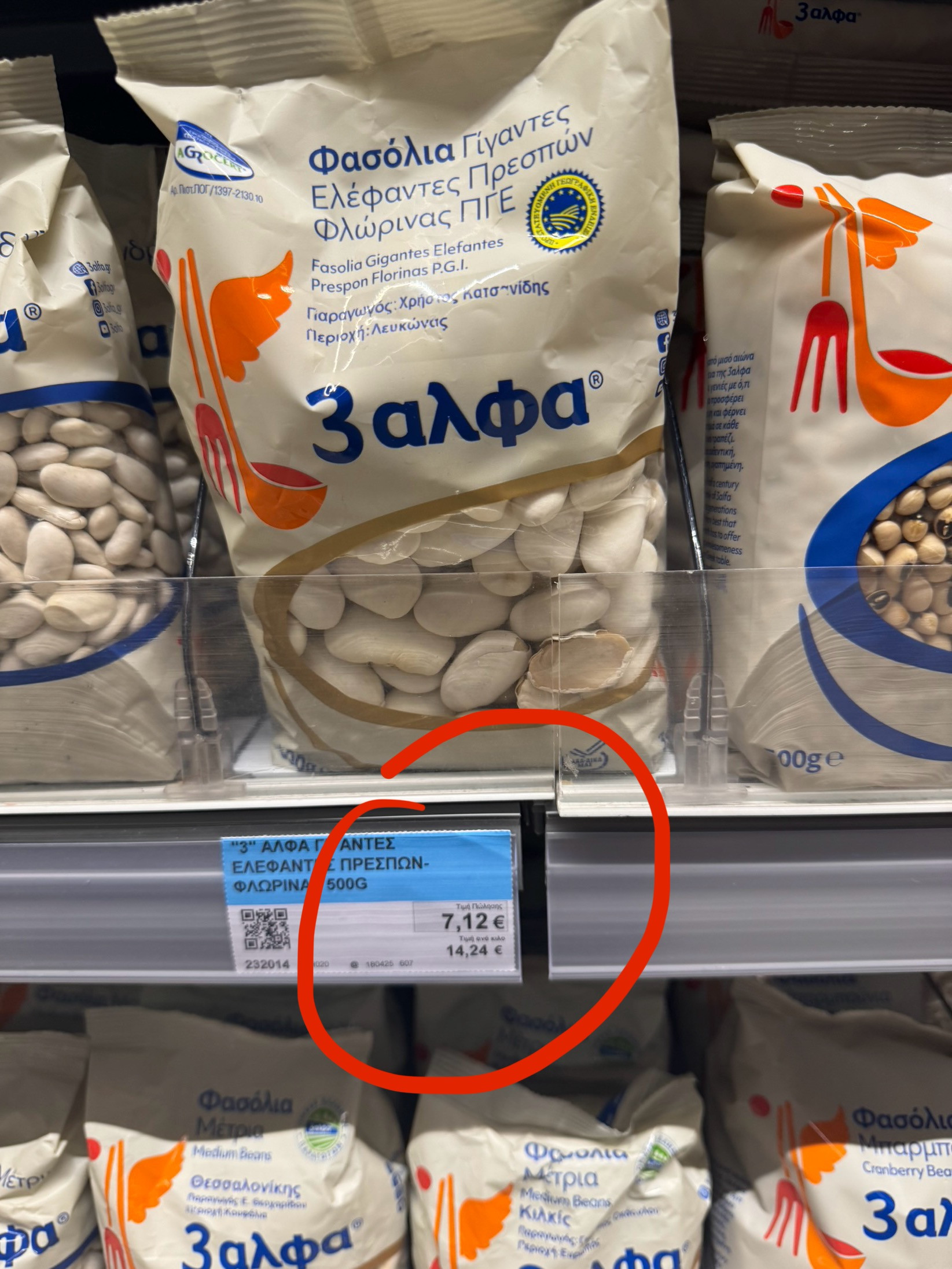 Στα ΑΒ οι γίγαντες 3Α, αν είναι Ελληνικοί έχουν 14,52€ το κιλό, ενώ αν είναι εισαγωγής έχουν 8,86€ το κιλό. Γιατί; Δεν θα έπρεπε λογικά οι Ελληνικοί να είναι πιο φτηνοί;Θα έλεγα τώρα που να τους βάλουν τους γίγαντες πρεσπων , αλλά έχε χάρη που δε μου φταίνε σε τίποτα τα έρμα τα φασόλια.