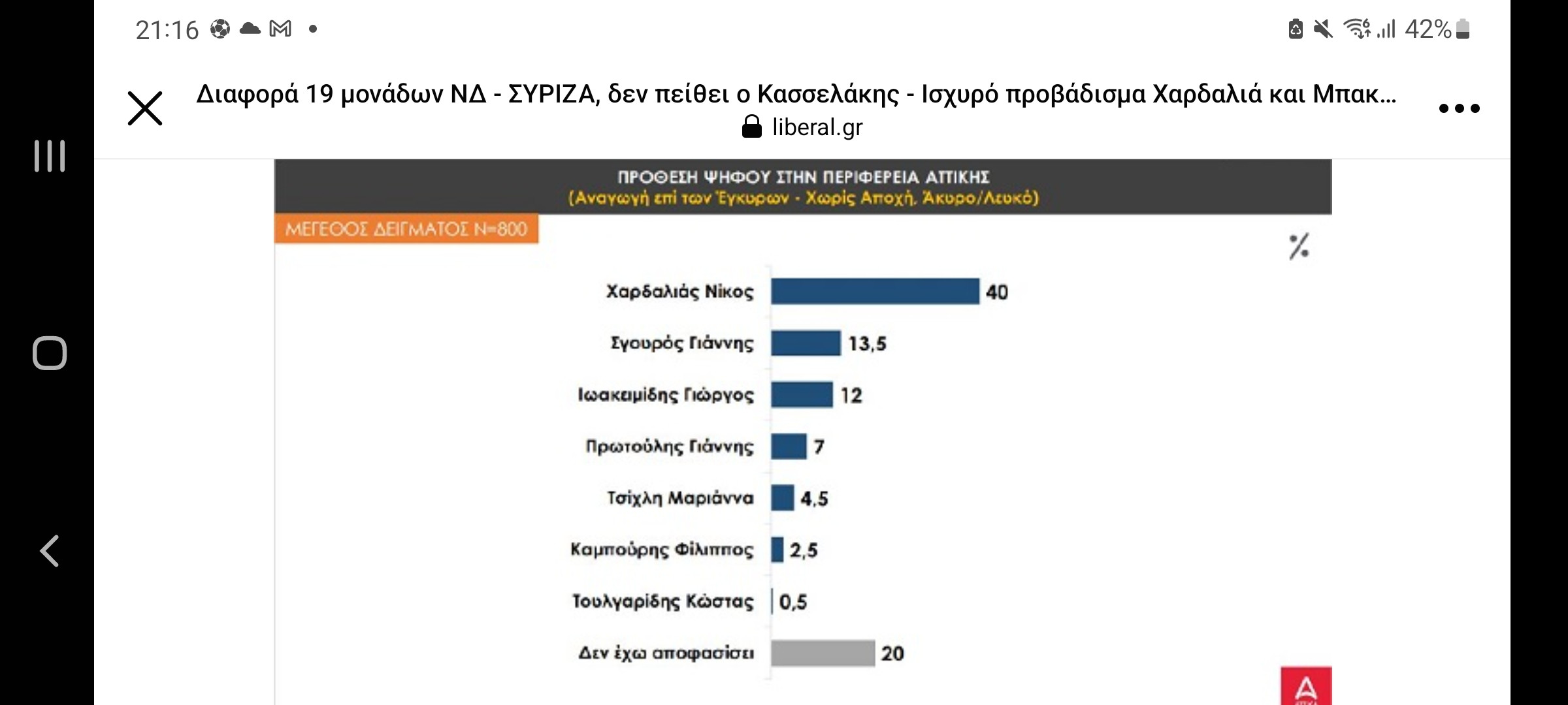 Δεν το θεωρώ και σίγουρο ότι θα έχουμε 2ο γύρο στην Αττική. Η δημοσκόπηση δίνει 40% στον Χαρδαλιά με 20% αναποφάσιστους. Νομίζω θα είναι κοντά στο όριο.