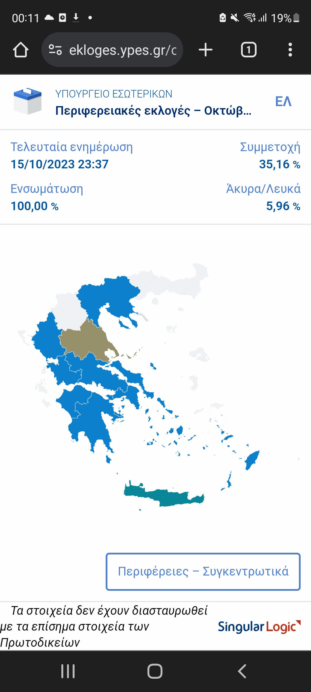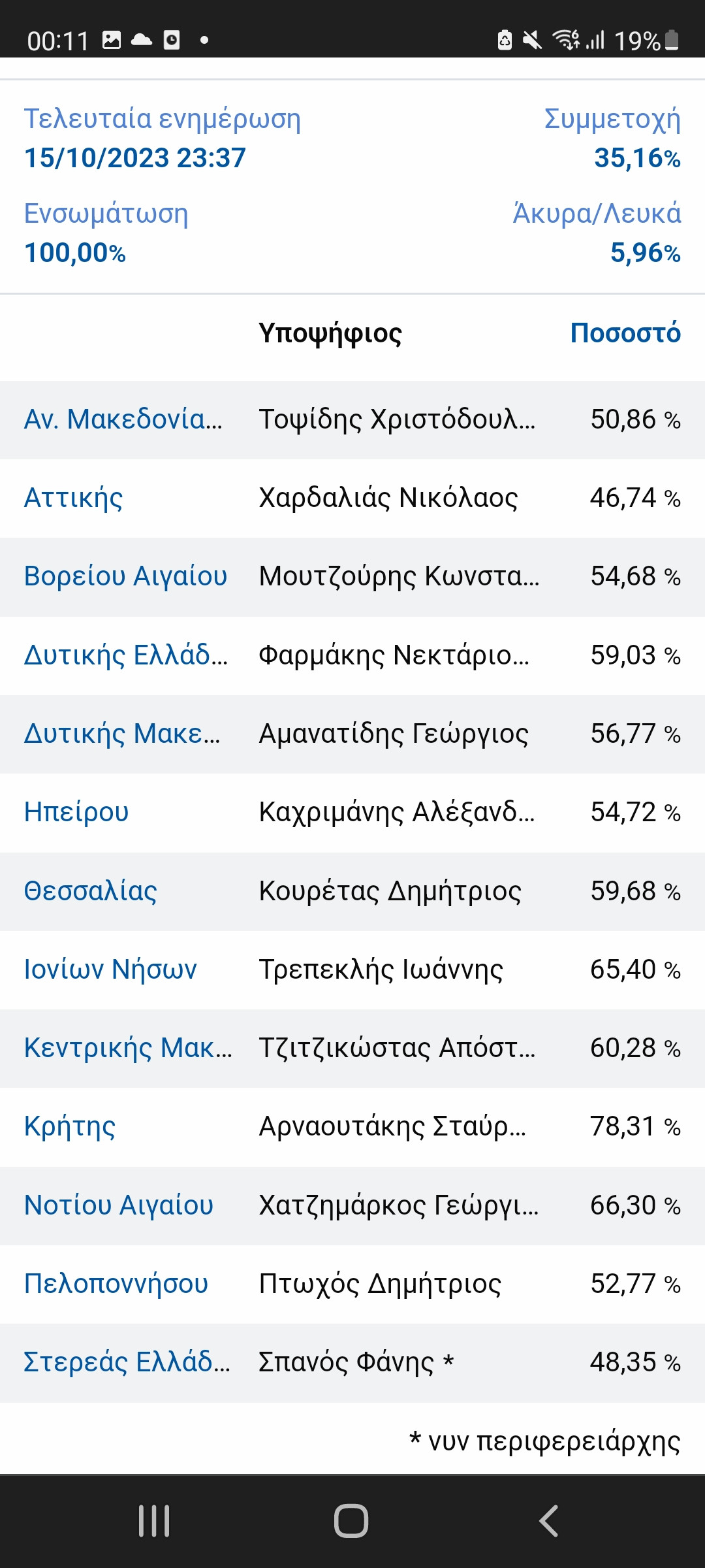 για τους δήμους δε σε έχω δει να λες κάτιΤελείωσε η καταμέτρηση στις περιφέρειες, τα αποτελέσματα δεν άλλαξαν σε σχέση με αυτό που είχα γράψει πριν λίγες ώρες.