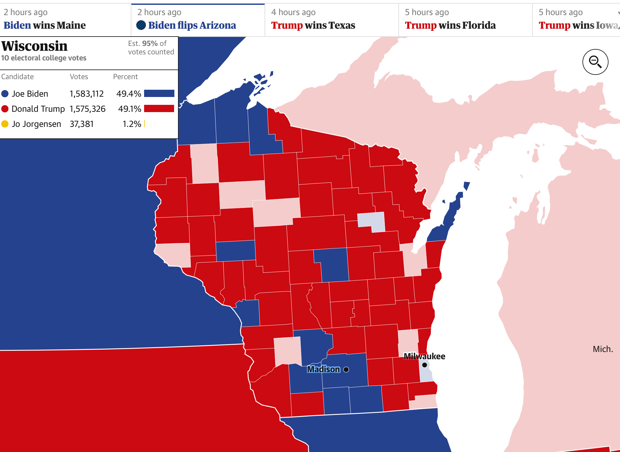 Μόλις το είδα , για 0.3 είναι μπροστά... αν πάρει το Wisconsin , ενδεχομένως να αναστήσει τις ελπίδες του ο Biden