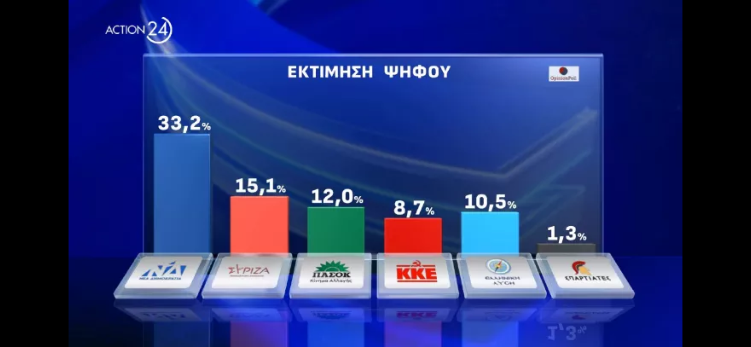 Στο 33,2% η ΝΔ, στο 15,1% ο ΣΥΡΙΖΑ και στο 12% το ΠΑΣΟΚ σύμφωνα με την εκτίμηση ψήφου στη νέα δημοσκόπηση.