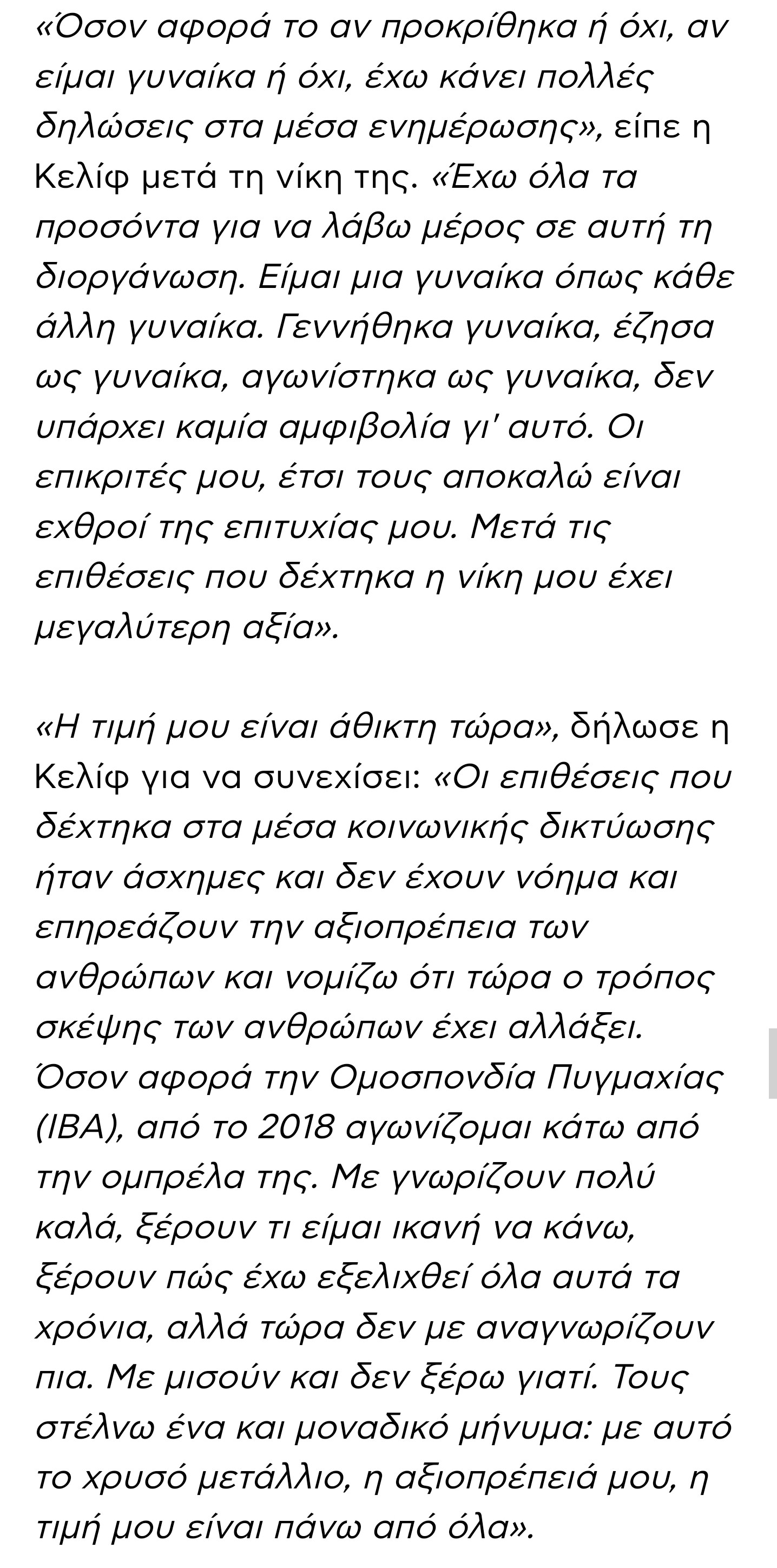 Κοιτά επειδή το θέμα έχει αναλυθεί παρά πολύ και ο καθένας γράφει ότι θέλει εγώ θα ξαναπώ ότι όλα αυτά τα άτομα έχουν προφανώς το δικαίωμα να αγωνίζονται αλλά σε ειδικές κατηγορίες, κατηγορίες που έπρεπε ήδη να υπάρχουν στους Ολυμπιακούς αγώνες. Σε καμία περίπτωση το φιάσκο που είδαμε δεν ήταν δίκαιο προς τις γυναίκες αθλήτριες ότι και να λένε οι δήθεν προοδευτικοί.