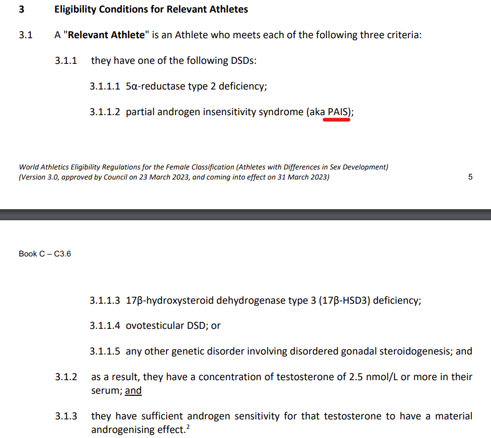 Αυτο που ουσιαστικα λεει το παραπανω ειναι πως οσοι θεωρουνται relevant athletes θα εχουν καποια κριτηρια/περιορισμους για να μπορεσουν να συμμετεχουν. Αν δεν ανηκεις στην κατηγορια relevant athlete, δηλαδη αν εισαι κανονικα ανδρας ΧΥ, κανονικα γυναικα ΧΧ, ή εχεις άλλα DSD συνδρομα που δεν ανηκουν στα παραπανω (οπως CAIS κι ας εισαι γυναικα ΧΥ), τοτε εγκρινεσαι αυτοματα να συμμετεχεις χωρις περιορισμους, εξετασεις, πιστοποιησεις κλπ, εισαι "κανονικος" καθως δεν θεωρειται πως εχεις "αδικο πλεονεκτημα".