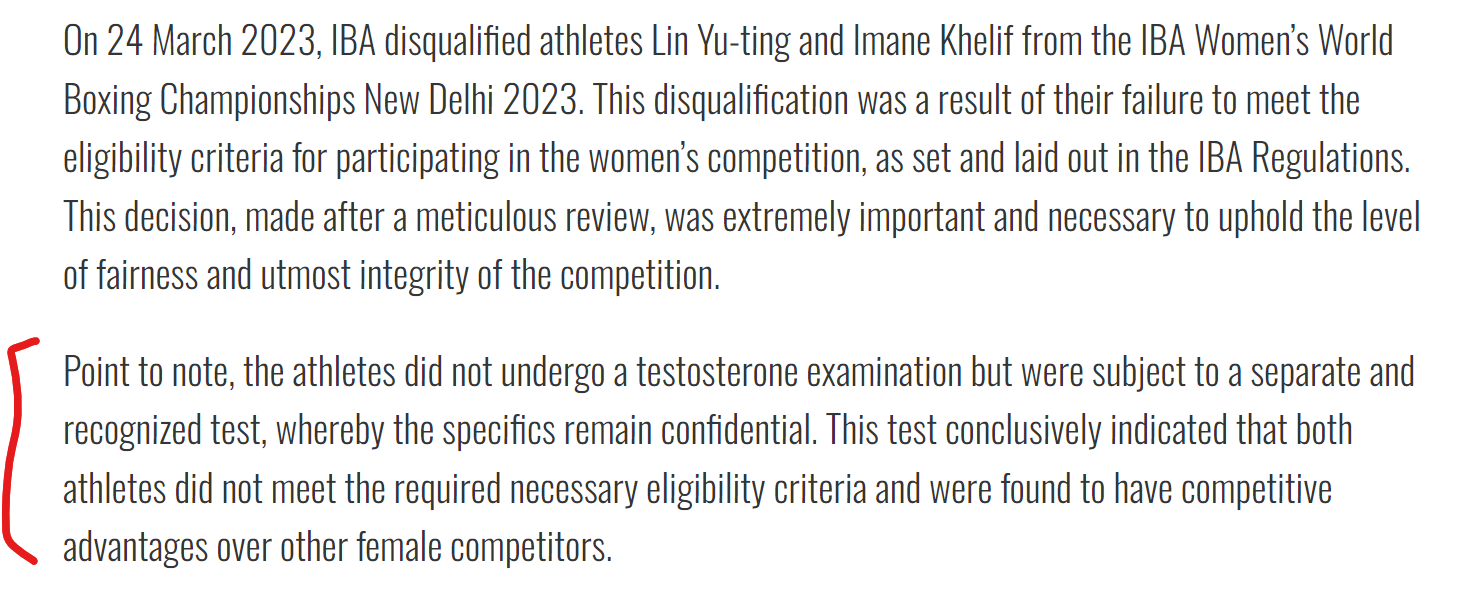 Έχω την εντύπωση ότι ήταν η επίσημη δικαιολογία αποκλεισμού της το 2023 από το παγκόσμιο πρωτάθλημα μποξ.Συν μια λεπτομέρεια, δεν ξέρουμε αν όντως έχει ΧΥ,