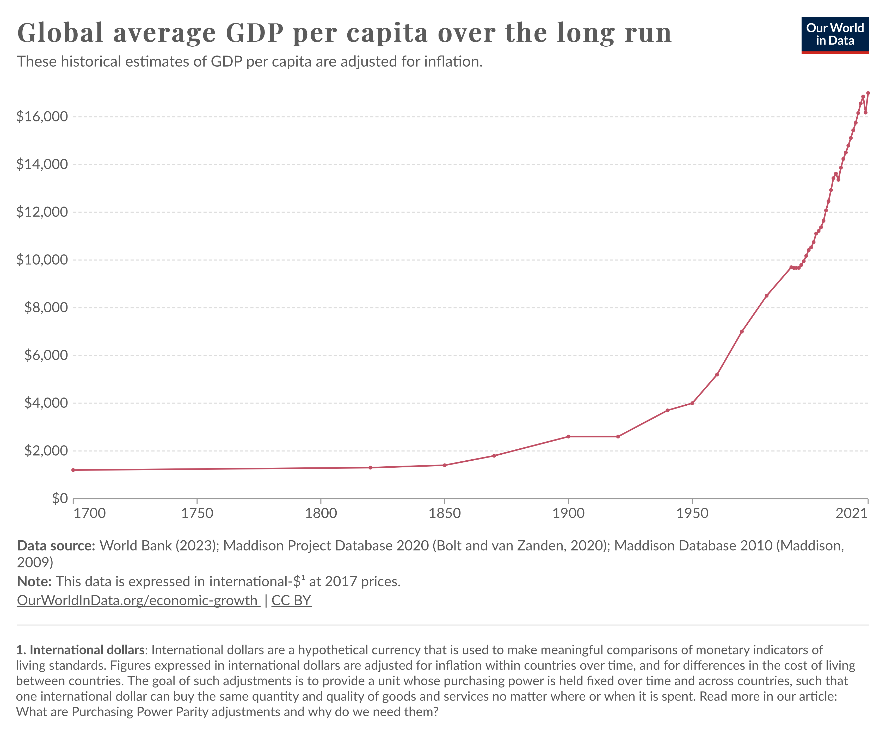 • Το GDP Per Capita εκτινάχθηκε από τα 1.200$ το έτος που ήταν το 1800 σε 17.000$ σήμερα, εκτίναξη κατά 1.320%. Αν πάμε στις αναπτυγμένες χώρες τότε η αύξηση πλησιάζει το 2.500% καθώς οι ΗΠΑ έχουν GDP Per Capita που φτάνει τα 64.000$ το έτος.