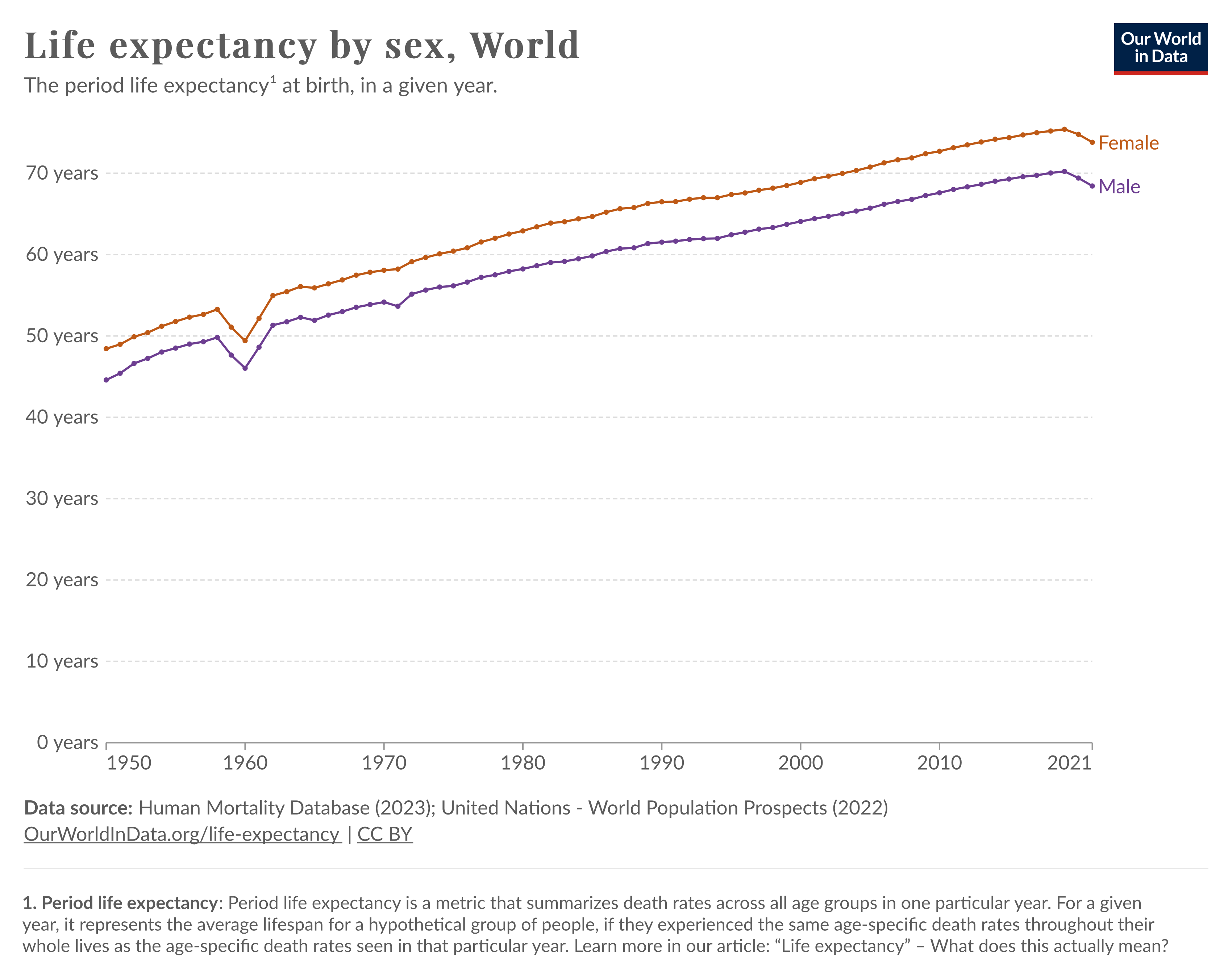 • Το παγκόσμιο life expectancy μέσα σε μόλις 70 χρόνια αυξήθηκε από τα 49 ετη στα 74 έτη ενώ αν κοιτάξουμε στις αναπτυγμένες χώρες τότε το νούμερο αυτό ξεπερνάει τα 80 ετη. Ζούμε περισσότερο από ποτέ λόγω της αναπτυξης της Ιατρικής και της βελτίωσης των συνθηκών ζωής τα οποία ευνόησε η κυριαρχία του Καπιταλισμού.
