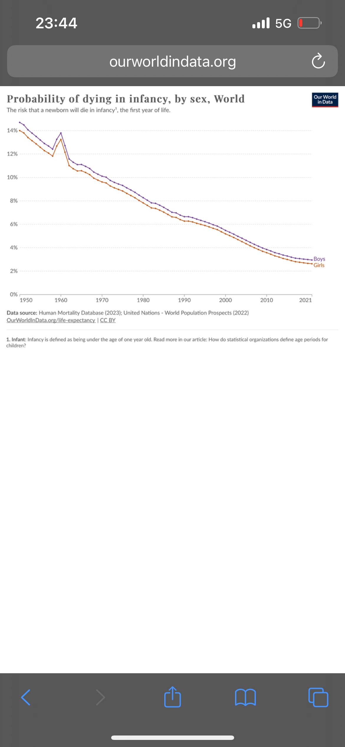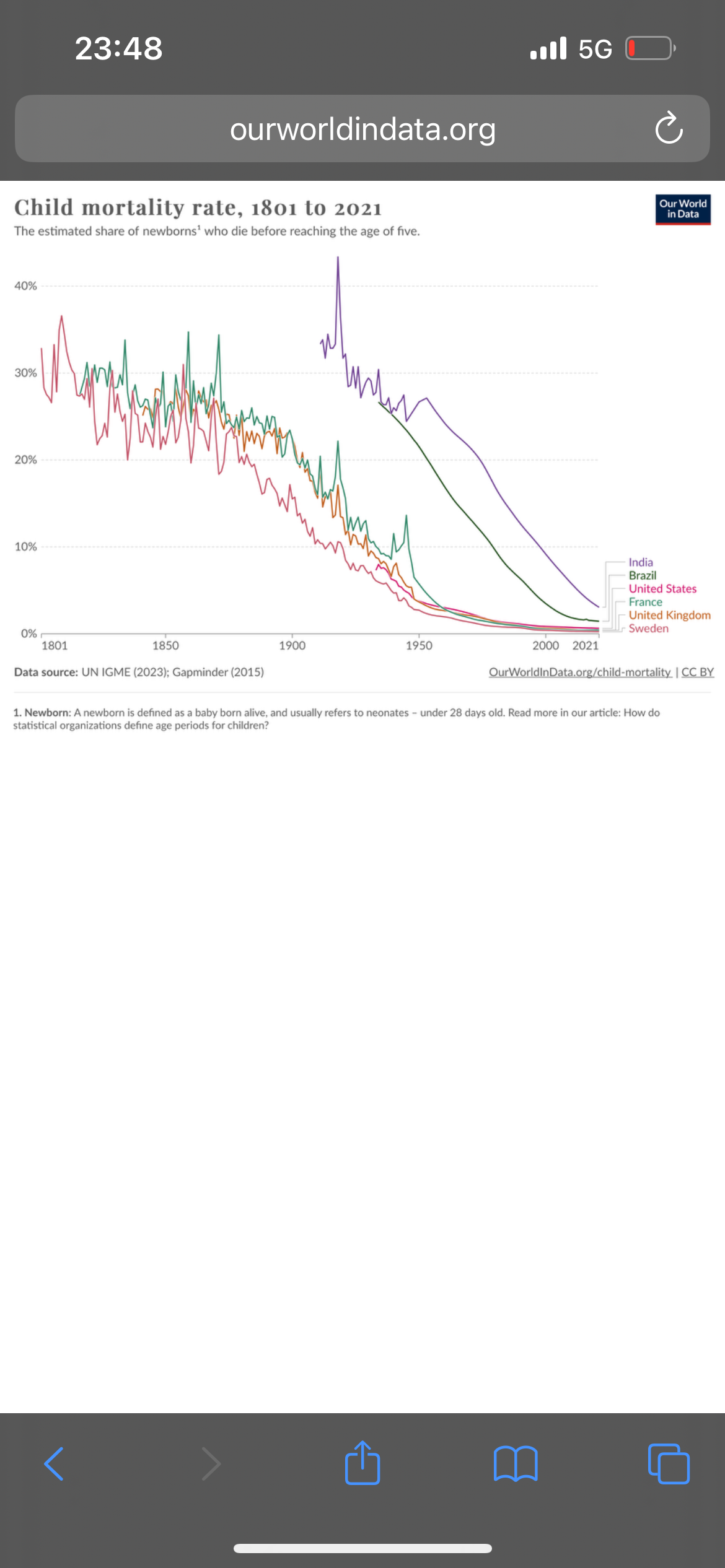 • Η παιδική θνησιμότητα στις αναπτυγμένες χώρες μειώθηκε από το 30% όπου βρισκόταν το 1800 σε μόλις 0.50% σήμερα ενώ μεγάλη μείωση έχουμε και στις λιγότερο αναπτυγμένες χώρες.