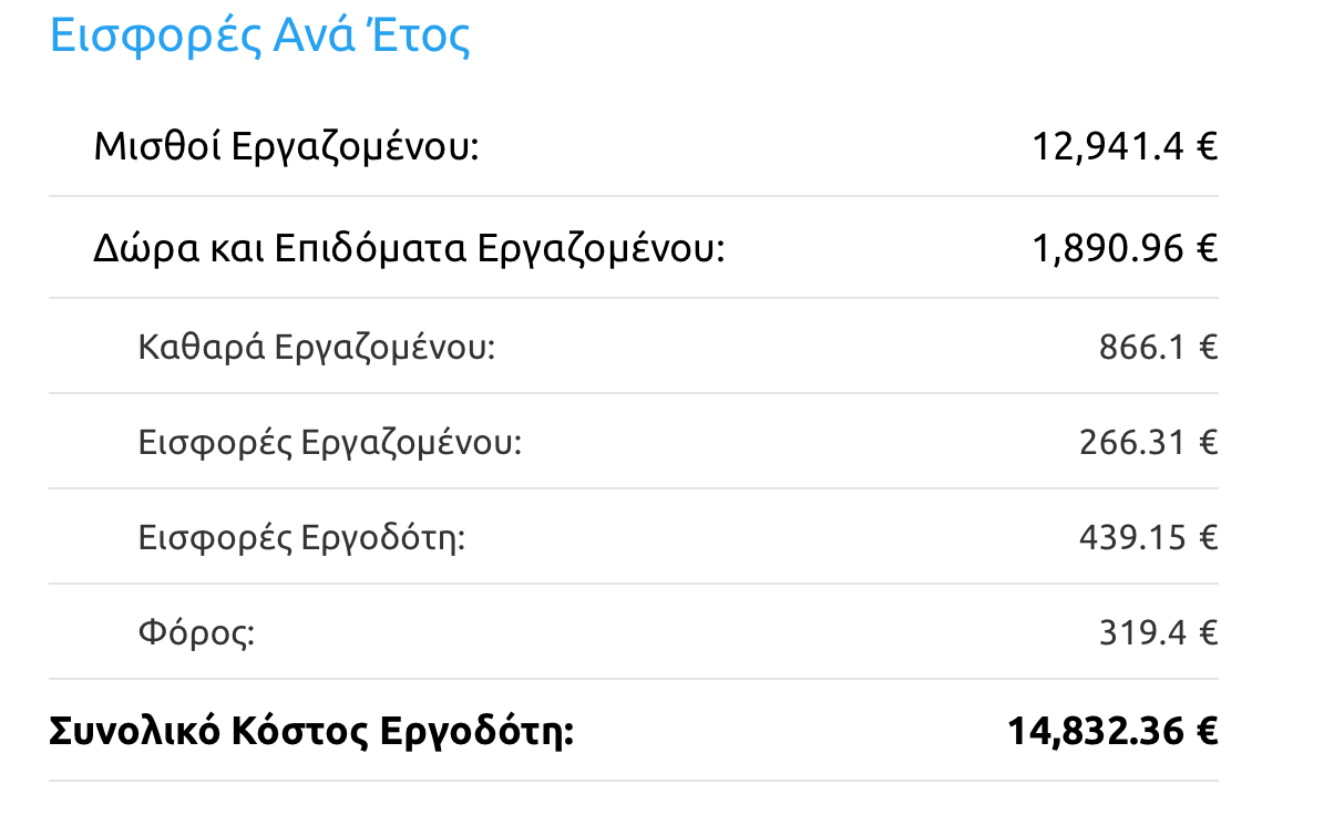 Από τη στιγμή που λες ότι το ΦΠΑ είναι φόρος του πελάτη (τυπικά έχεις δίκαιο) έχω δικαίωμα να πω ότι και οι εισφορές του εργοδότη είναι ποσό που δεν πληρώνει ο μισθωτός. Οι εισφορές του μισθωτού είναι πιο λίγες από του ελεύθερου επαγγελματία στα ίδια ποσά. Μην ξεχνάς ότι δεύτερος δεν έχει αφορολόγητο καθόλου ενώ ο μισθοτός της παρακάτω εικόνας δεν θα πληρώσει φόρο εισοδήματος.