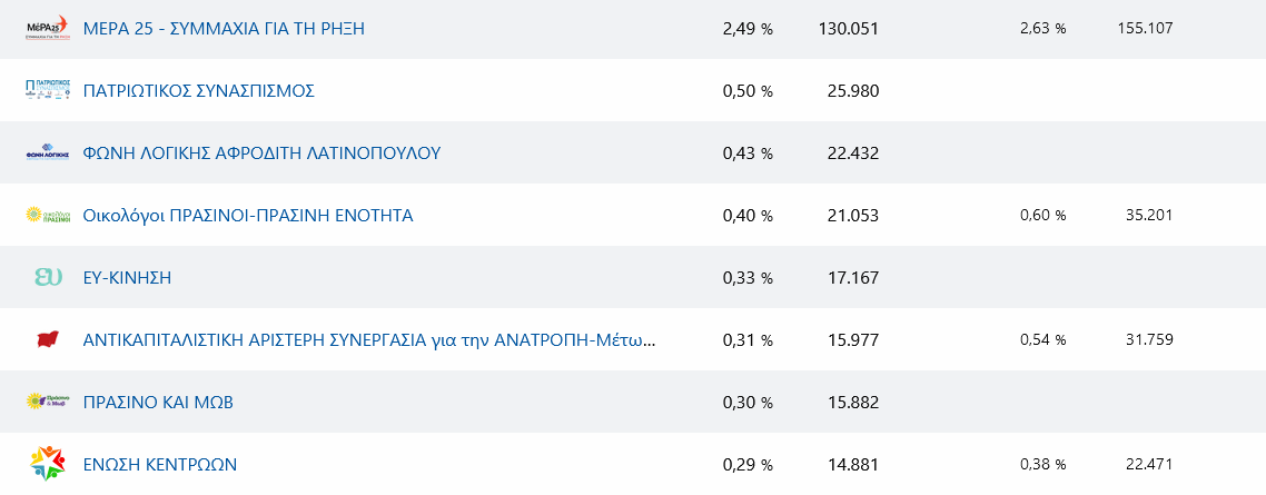 Εντύπωση προκαλεί το γεγονός ότι σε αυτές ειδικά, αλλά και στις προηγούμενες εκλογές, δεν υπάρχει κανένα κόμμα στο 1%, ούτε καν πάνω από 0.5, μέχρι το ΜΕΡΑ25. Τα μικρά κομματίδια καταποντίστηκαν, ακόμη και η ένωση Μπογδάνου-Εμφιετζόγλου, που αποτελούνταν από κόμματα που συμμετείχαν και το Μάιο, αθροιστικά δεν έπιασαν το 1. Μέχρι και η Λατινοπούλου πήγε να τους φτάσει.