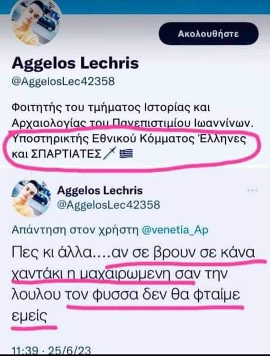 Όντως ένα κόμμα, με τέτοια νίκη, μόνο με ένα 12% δε θα έπρεπε να ασχολείται... αφού ούτως ή άλλως και οι ίδιοι δεν ενδιαφέρονται εκλογικά για τον δεξιό πολίτη πια.Η ΝΔ με 40.5% και οι μπροοδευτικοί να ασχολούνται με ΝΙΚΗ, Ελληνική Λύση, ΣΠΑΡΤΙΆΤΕΣ. Α ρε πόσο μακρύ χέρι του συστήματος είστε. Δεκανίκια της woke ΝΔ.