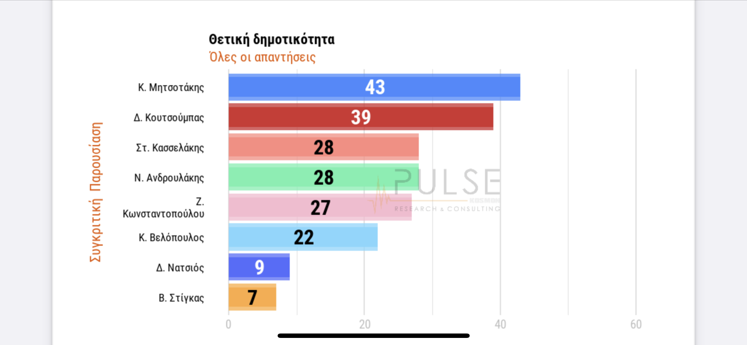 Όσον αφορά τη δημοτικότητα των πολιτικών αρχηγών, ο Μητσοτάκης λαμβάνει το 45%, ενώ ο Κασσελάκης λαμβάνει το 31%.