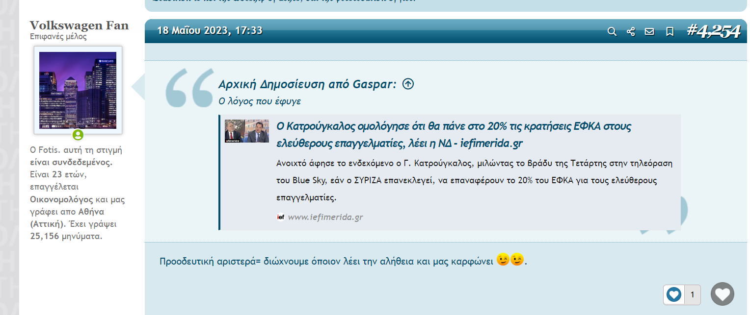 Ο Fotis. αυτή τη στιγμή δεν είναι συνδεδεμένος. Είναι 25 ετών, επαγγέλλεται Οικονομολόγος και μας γράφει από Αθήνα (Αττική). Έχει γράψει 35.536 μηνύματα.