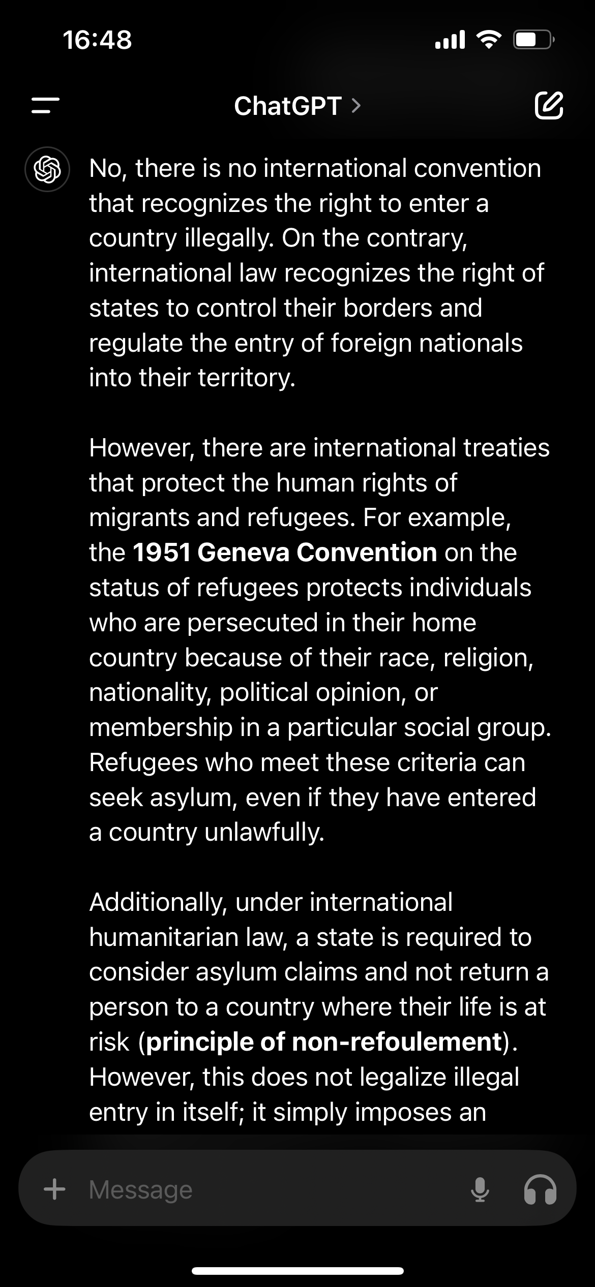 Θα πω ξανά ότι δεν υπάρχει καμία διεθνής σύμβαση που κατοχυρώνει το δικαίωμα στην παράνομη μετανάστευση, ίσα ίσα όλες οι διεθνής συνθήκες αναγράφουν ξεκάθαρα ότι οι χώρες έχουν βασικό δικαίωμα στην προστασία των συνόρων τους. Το μόνο που υπάρχει είναι η περίπτωση ασύλου όπου το κράτος πρέπει να εξετάσει τις διάφορες αιτήσεις που δέχεται, όμως και πάλι αυτό δεν σημαίνει ότι είναι νόμιμη η παράνομη μετανάστευση ούτε ότι οι παράνομοι μετανάστες έχουν δικαίωμα να εργαστούν χωρίς χαρτιά.