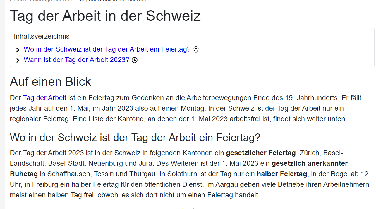 Κάποια καντόνια, και συγκεκριμένα 11 από τα 26 (δηλαδή ούτε τα μισά), δίνουν τη μισή ή όλη τη μέρα off. Αυτό δεν έχει να κάνει με την ελβετική νομοθεσία. Σε παραπάνω από τα μισά καντόνια της χώρας οι πολίτες δουλεύουν κανονικά την 1η Μαίου σαν κανονική εργάσιμη.