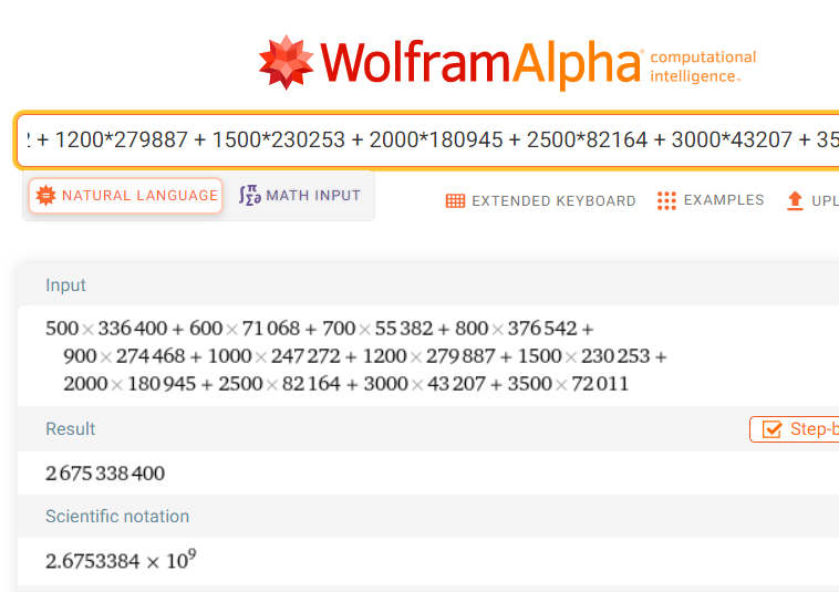 στα επιμερους γινομενα εβαλα ως τιμη που πολλαπλασιαζεται, την μεγιστη τιμη της καθε κατηγοριας, δηλαδη πχ για την κατηγορια 601€-700€ εβαλα σαν τιμη το 700, ομοιως και στα υπολοιπα. Για την τελευταια κατηγορια των >3000 εβαλα σαν ενδεικτικη max τιμη το 3500.