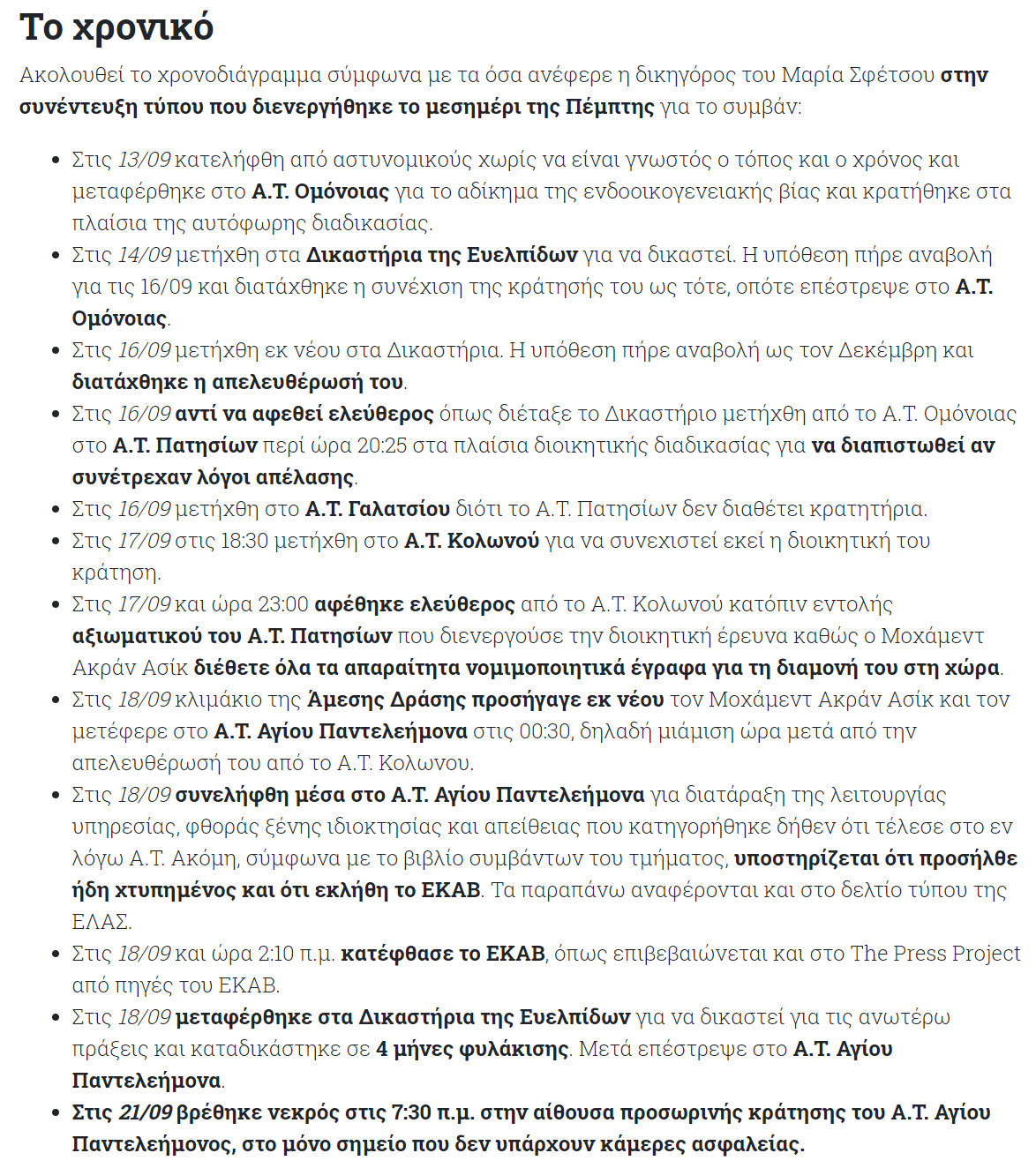 Η δικηγόρος καταγγέλλει ότι «ο Μοχάμεντ βασανίστηκε αλυσοδεμένος» στο Α.Τ. Αγίου Παντελεήμονα. «Η αστυνομία ισχυρίστηκε προφορικά ότι ήρθε χτυπημένος επειδή έμπλεξε σε καυγά και ότι μέσα στο αστυνομικό τμήμα άρχισε να χτυπιέται μόνος του. Αν δείτε τα τραύματά του, το βάθος των τραυμάτων του και στους δύο καρπούς του, το κορμί του χτυπημένο σε κάθε σημείο του, σίγουρα καταλαβαίνεις ότι δεν ήταν καυγάς.