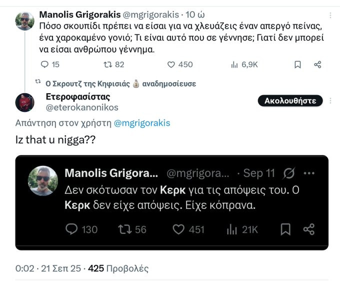 Συμφωνώ απόλυτα. Οι περιπτώσεις που μάζευε ήταν σούργελα και καμένοι (μπορεί κάποιους να τους έδιναν και κάνα χαρτζιλίκι) και ο λόγος δεν ήταν τόσο να δειχθεί σαν καλός ομιλητής όσο να ταυτίζει ο κόσμος που είναι ψιλοουδέτερος τους αριστεροπροοδευτικούς με αυτούς. Είναι κλασσικός μηχανισμός προπαγάνδας, τον οποίον χρησιμοποιούν κατά κόρον στην αριστερά (πχ πάντα προβάλουν αγράμματους φασίστες και Χριστιανοταλιμπάν) και επιτέλους τα τελευταία χρόνια εδέησαν να τον αξιοποιήσουν σοβαρά και οι συντηρητικοί.Αυτη ηταν η δουλεια του. Ragebait εκανε για προβολες , λαικς και virality στα social media. Επελεγε επιτηδες χαζοφοιτητες αντιθετης ιδεολογιας, τους ταπωνε (ηταν εξαιρετικος ομιλητης) και μαζευε κοσμο.