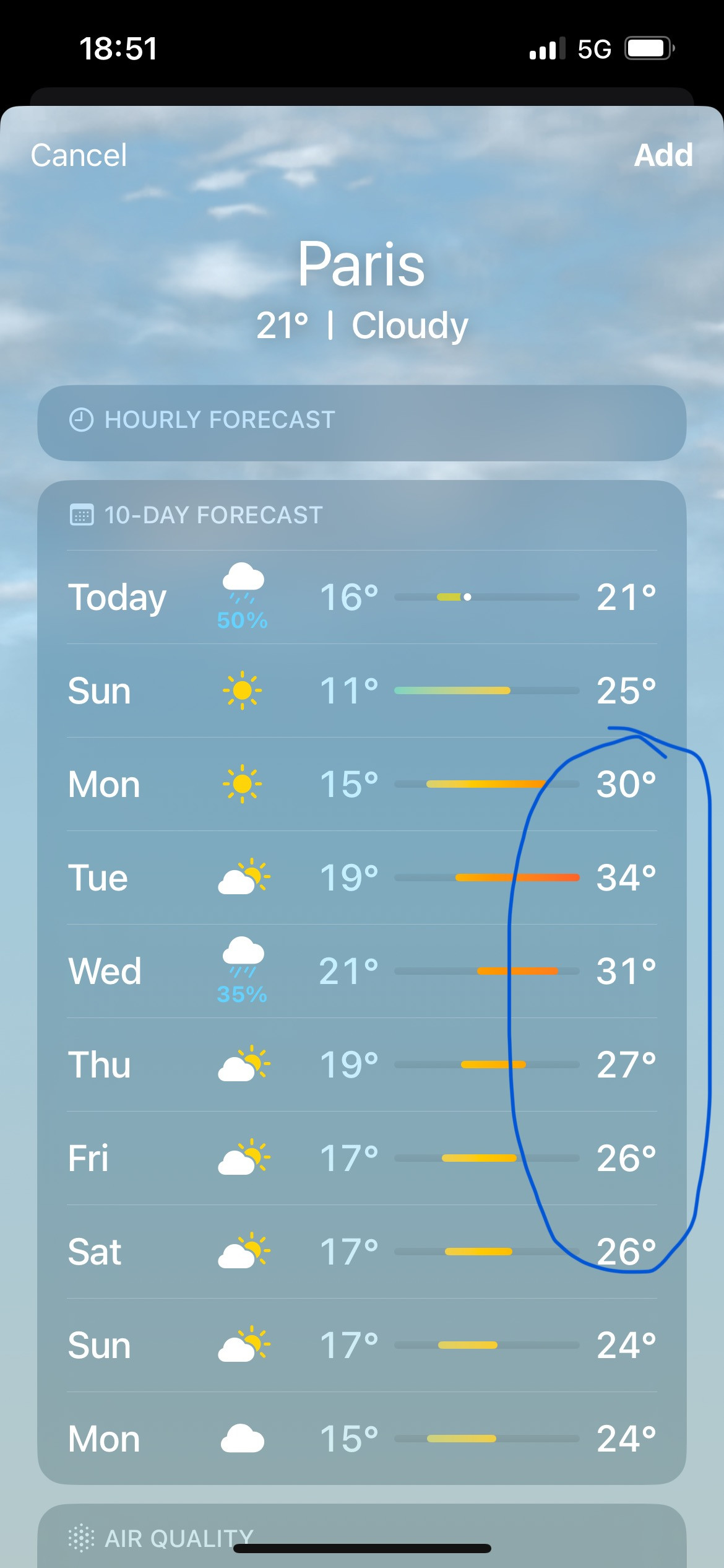 Με 24 βαθμούς μέση θερμοκρασία είναι επίγειος παράδεισος το Παρίσι. Δεν χρειάζονται κλιματιστικά. Και από ο,τι φαίνεται δεν αλλάζει αυτό μέχρι 10 Αυγούστου. Μόνο αύριο και μεθαύριο θα έχει υψηλή 29 και 32 βαθμούς αντίστοιχα. Το πρωί όμως πέφτει στους 20. Μακάρι να είχα σπίτι στο Παρίσι...